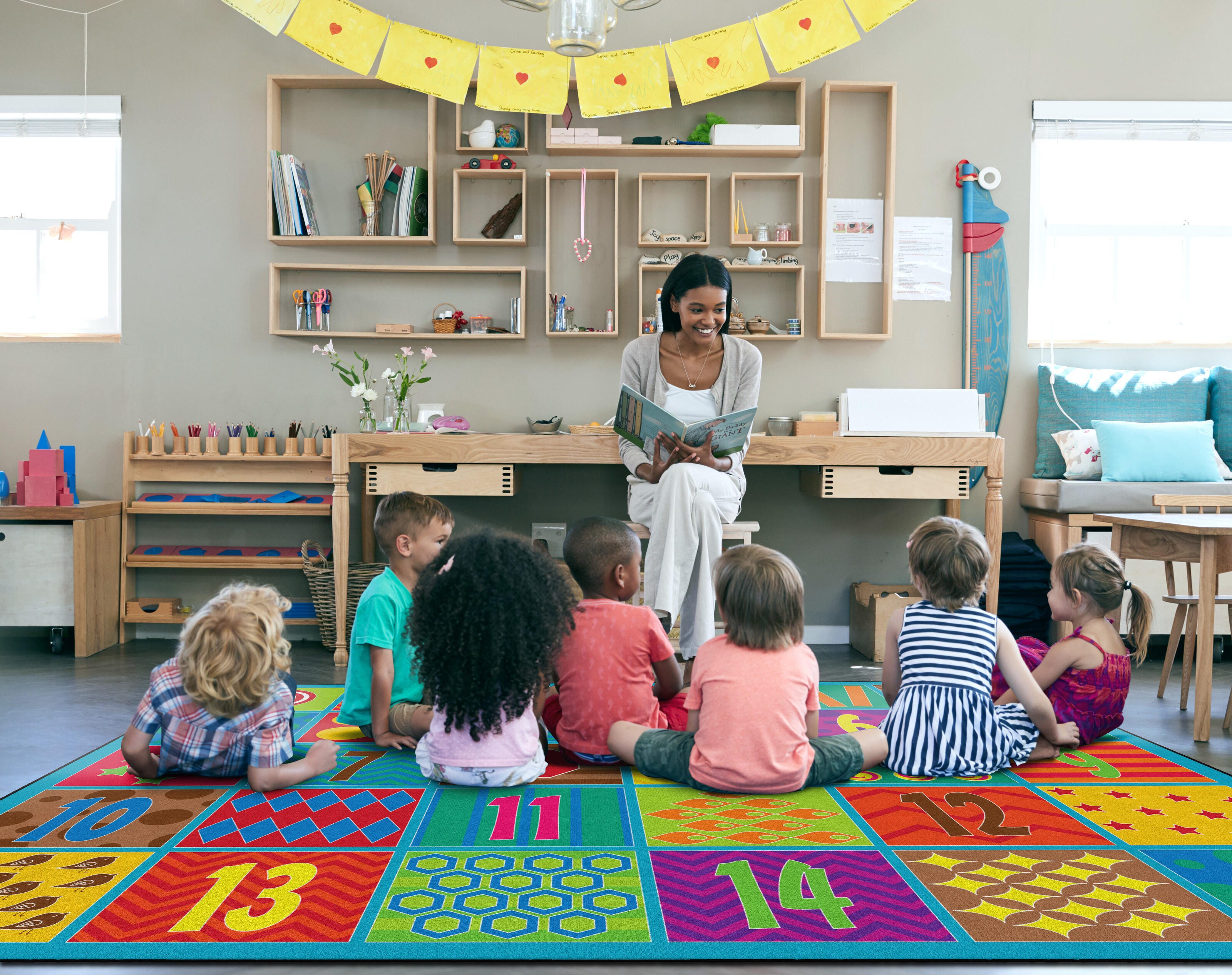 Flagship Carpets Counting Fun uses numbers and shapes teach 'how many' each number means. Bright colors and playful patterns add stylish organized seating to your classroom. Seats 24.
