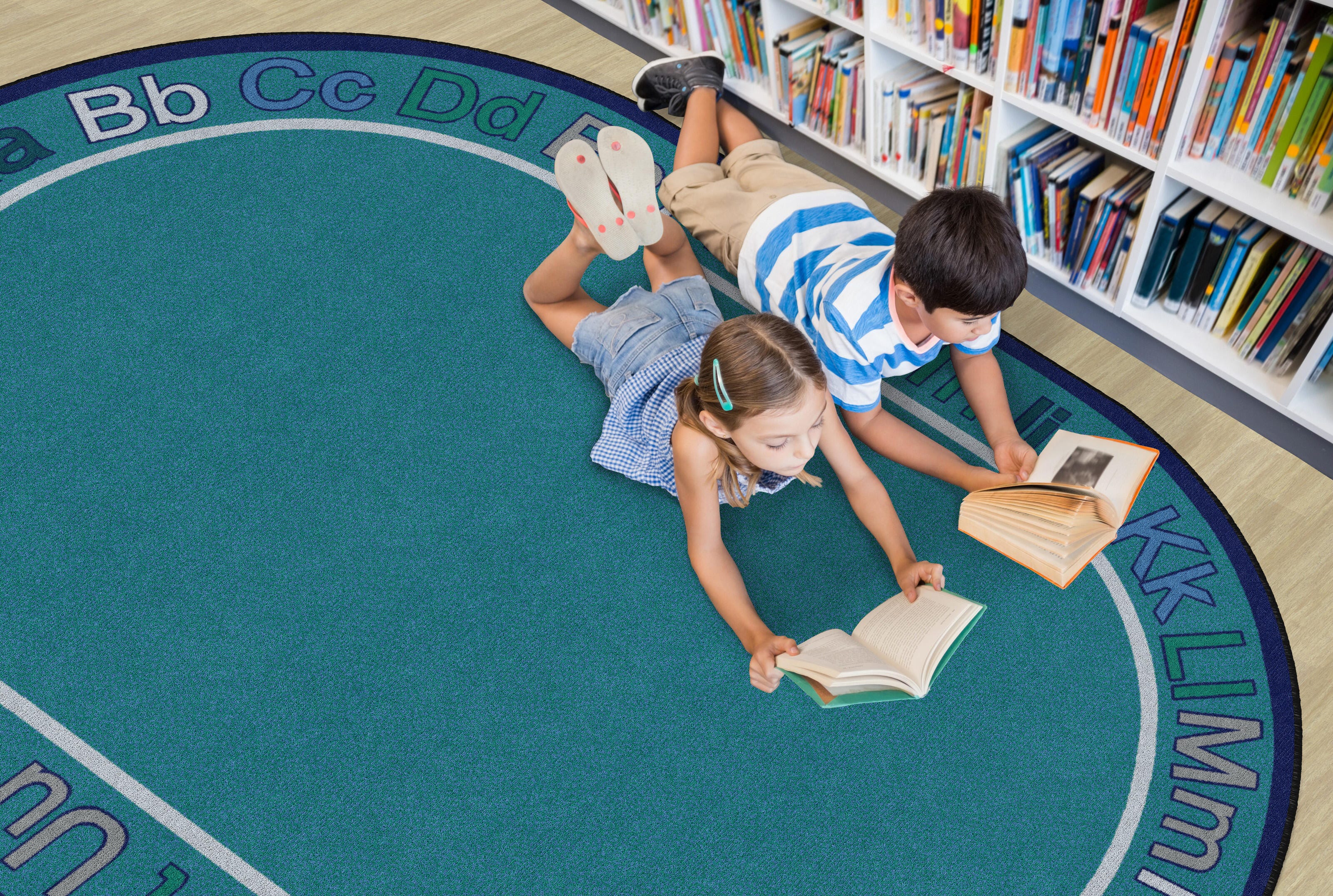 Flagship Carpets Know Your ABCs oval carpet helps students in letter recognition by allowing them to learn the alphabet using upper- and lowercase letters. Washable carpets feature skid-resistant backing to prevent slips and trips, and are treated with SCOTCHGARD-PROTECTOR for superior soil resistance and FORCE 5, a permanent anti-microbial agent to guard against odor, mildew, and mold. All Flagship Carpets are CRI Green Label Plus Certified. Backing contains synthetic (SBR) latex for those with latex allergies. Available in several sizes to match your space. Please select the size that best fits your space when ordering.Features