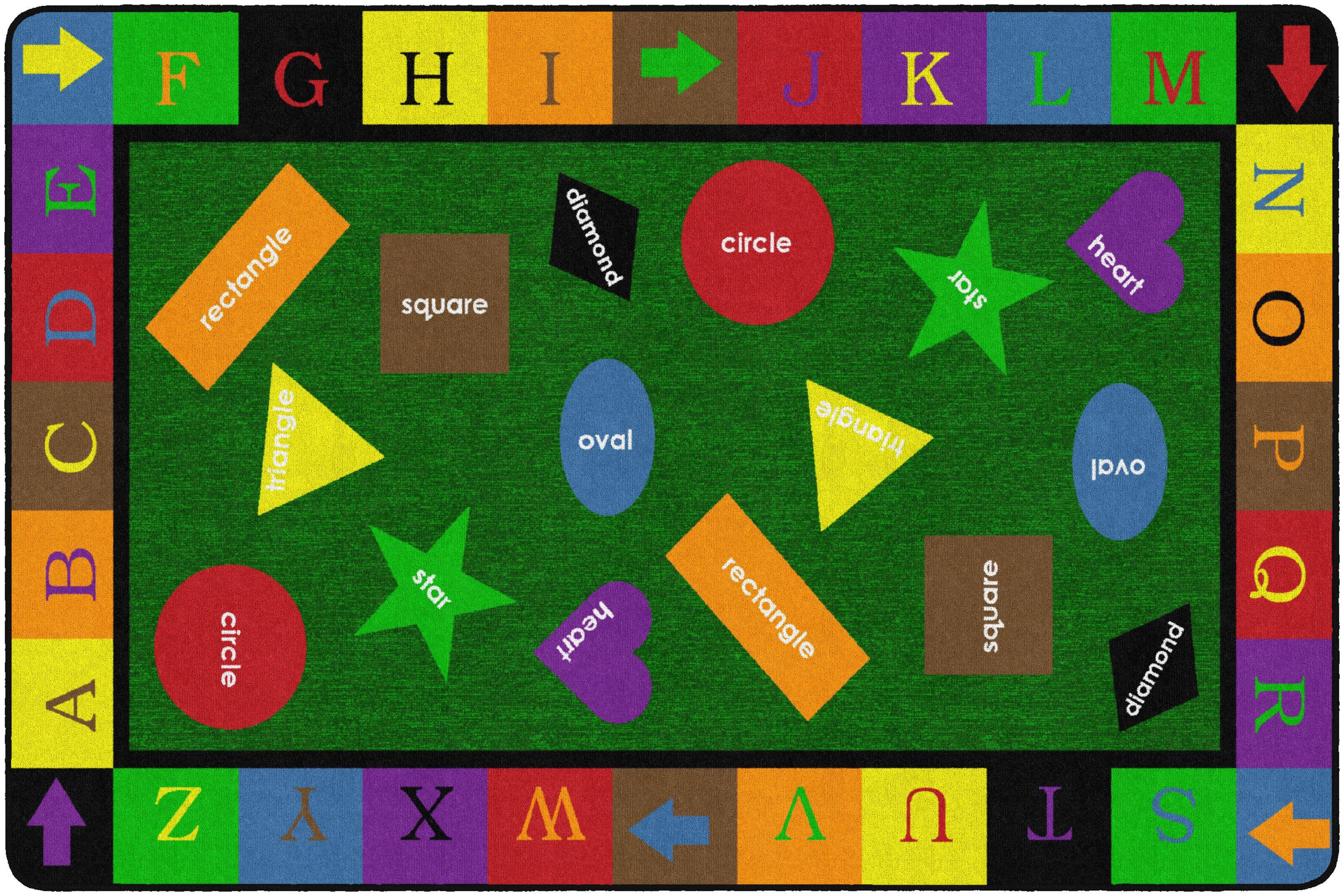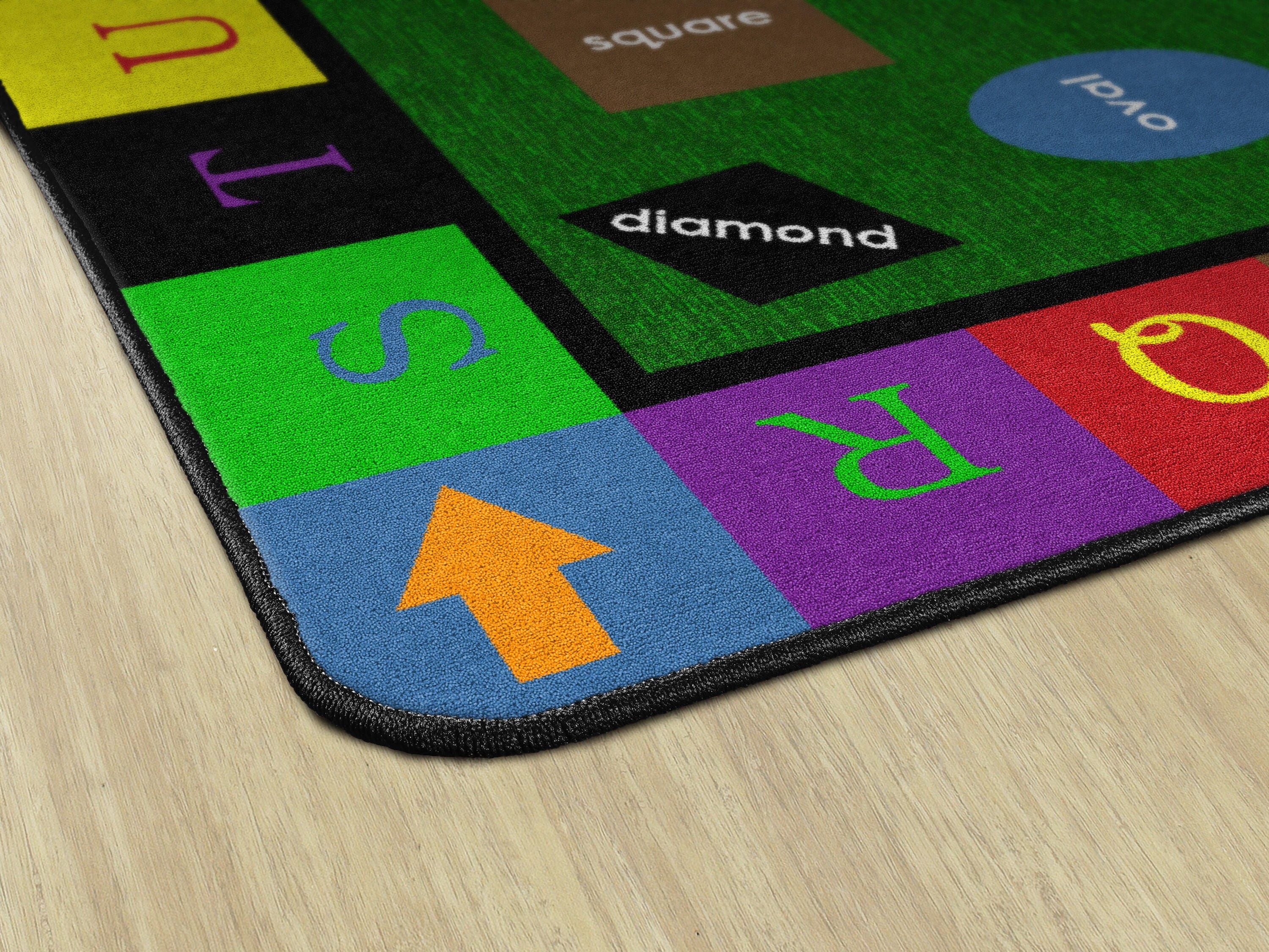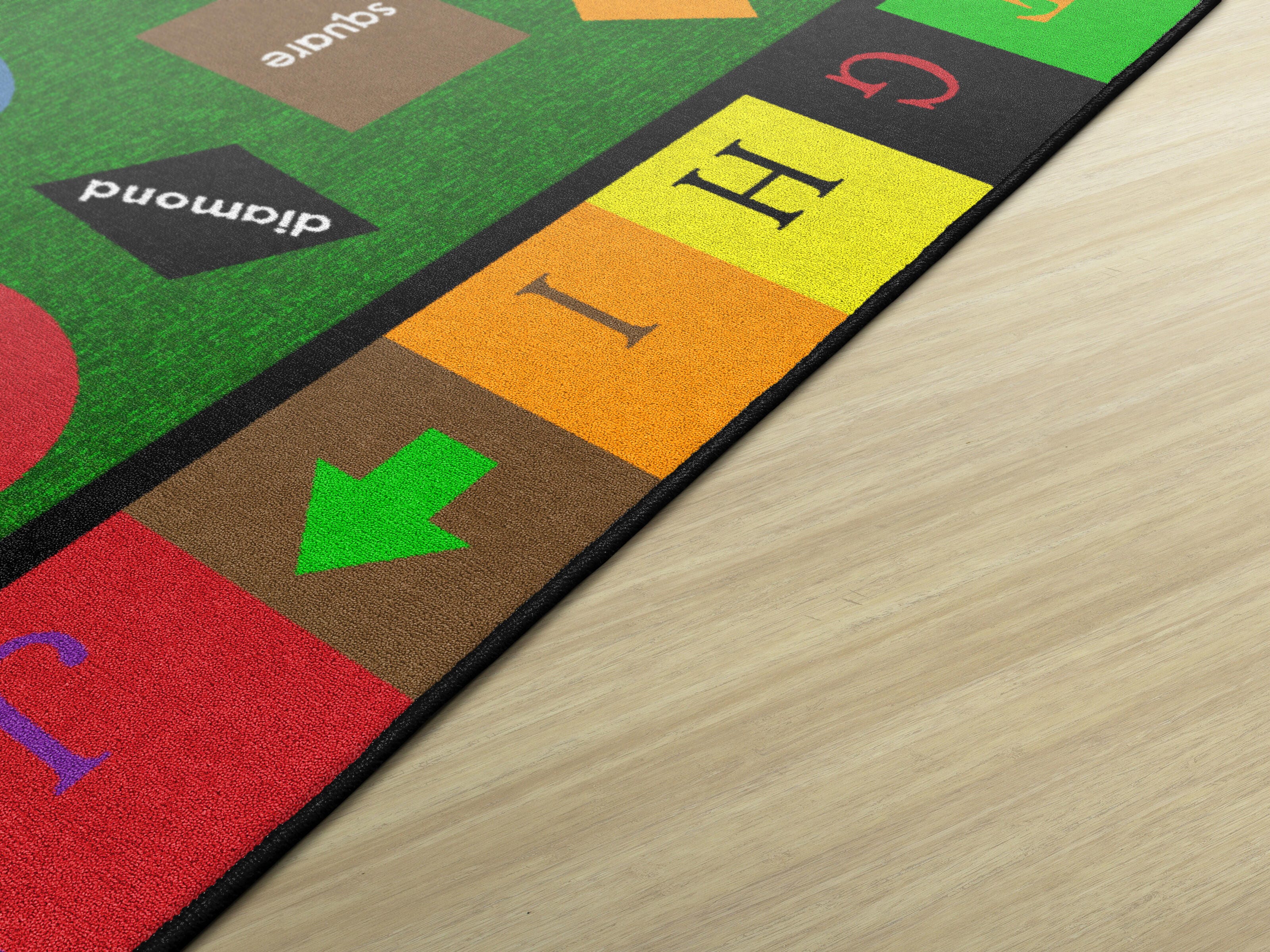 The Flagship Carpets Simple Shapes Carpet is a great choice to teach the early learners the alphabet and shapes. This bright classroom rug features 16 different shapes in bright primary colors at the center and the full alphabet around the edges. This educational and colorful carpet is constructed of dense nylon fiber and treated with Scotchguard stain protection. The edges are tightly bound and double-stitched for maximum strength, and the skid-resistant Action Bac woven backing system prevents wrinkles and bunching so it provides long-lasting use. A permanent antimicrobial treatment protects against odors, mold, and mildew to keep it safe and clean in any classroom, preschool, childcare center, or home.Features