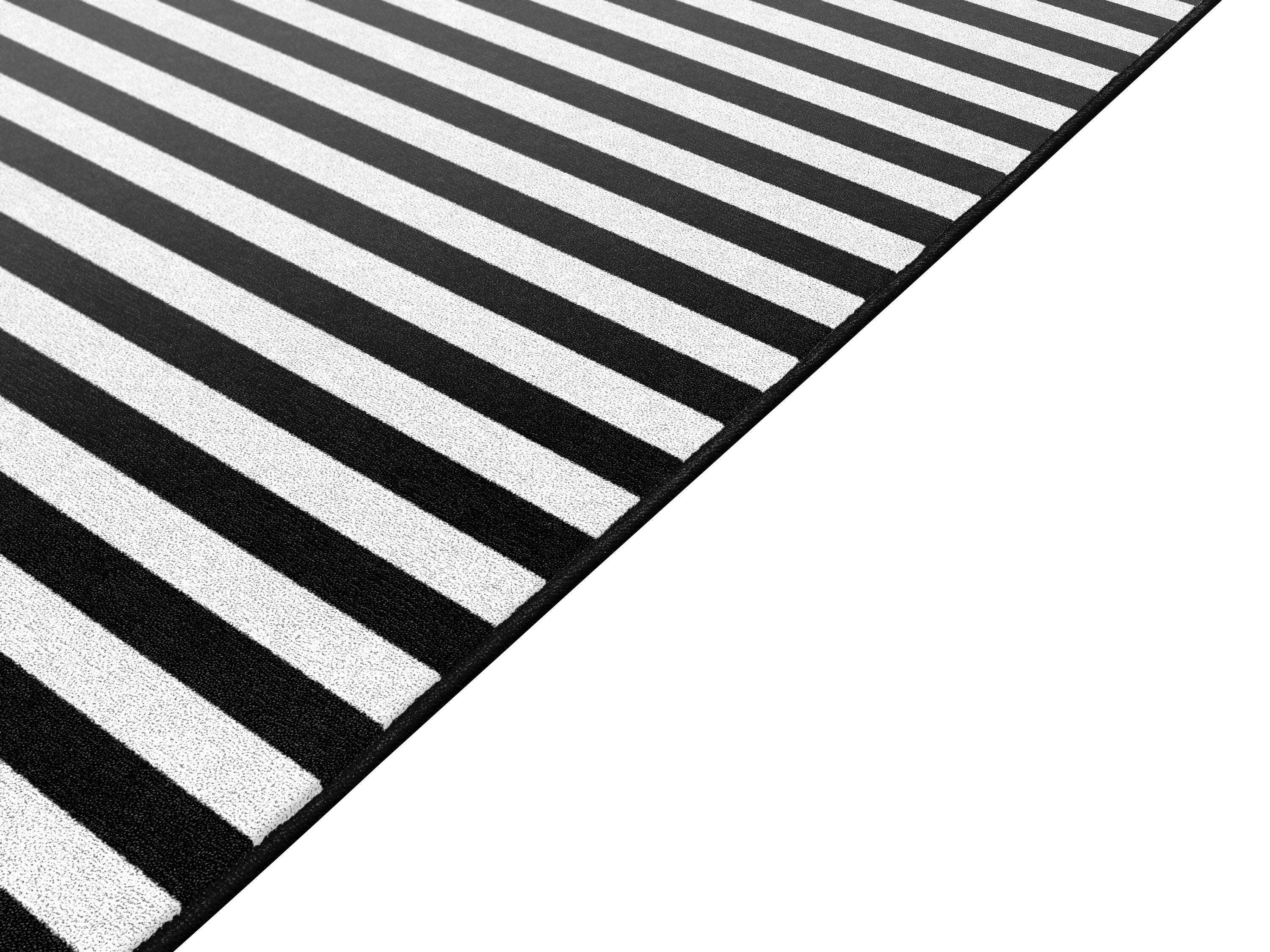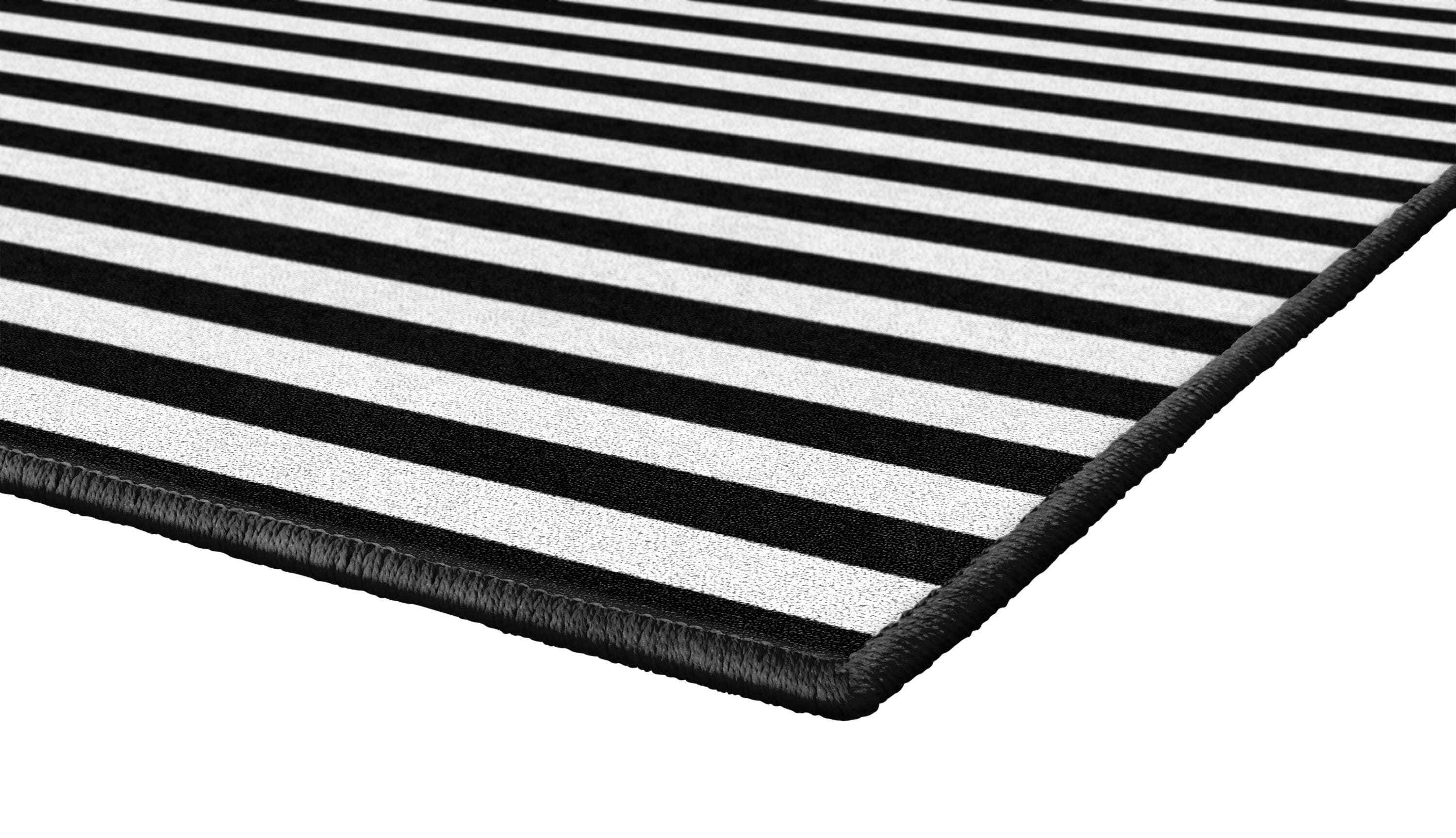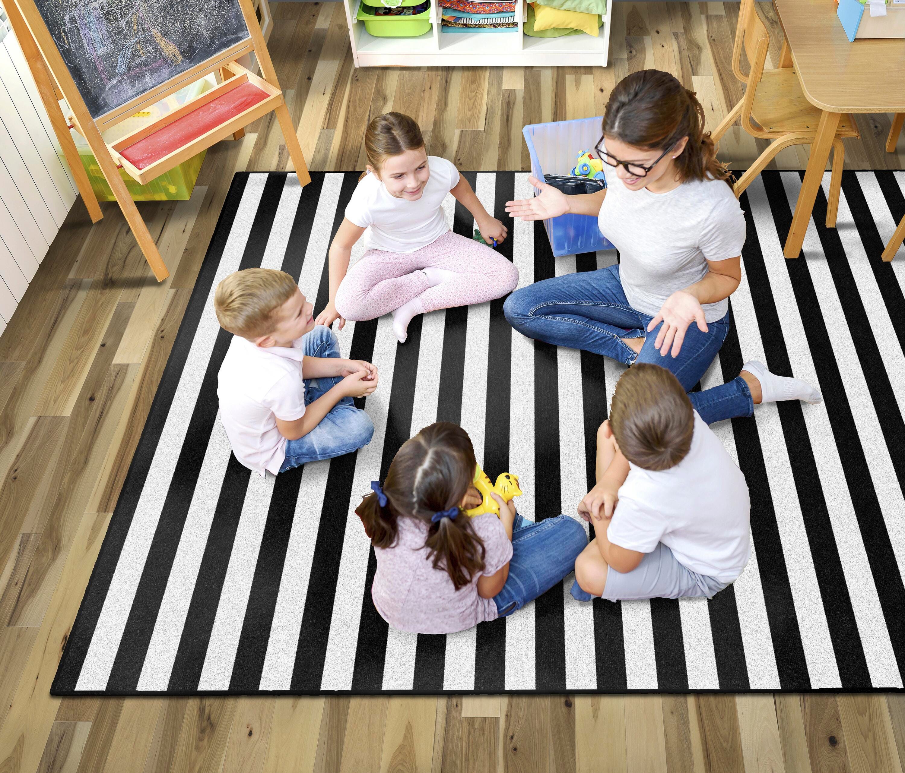 Classic black-and-white stripes found in this classroom carpet is the versatile design solution for your space. These stripes can match with bright and colorful designs typically found in educational environments like the classroom, playroom, childcare center, or preschool. They can add a pop of fun to modern or typical Montessori design without clashing. All while being durable to withstand the dynamic demands of the high-energy children who frequent your space. No matter your aesthetic, this elevated classic will polish any room where it's placed. This rectangular rug is available in several sizes. Please select the size that fits your space best when ordering.Features
