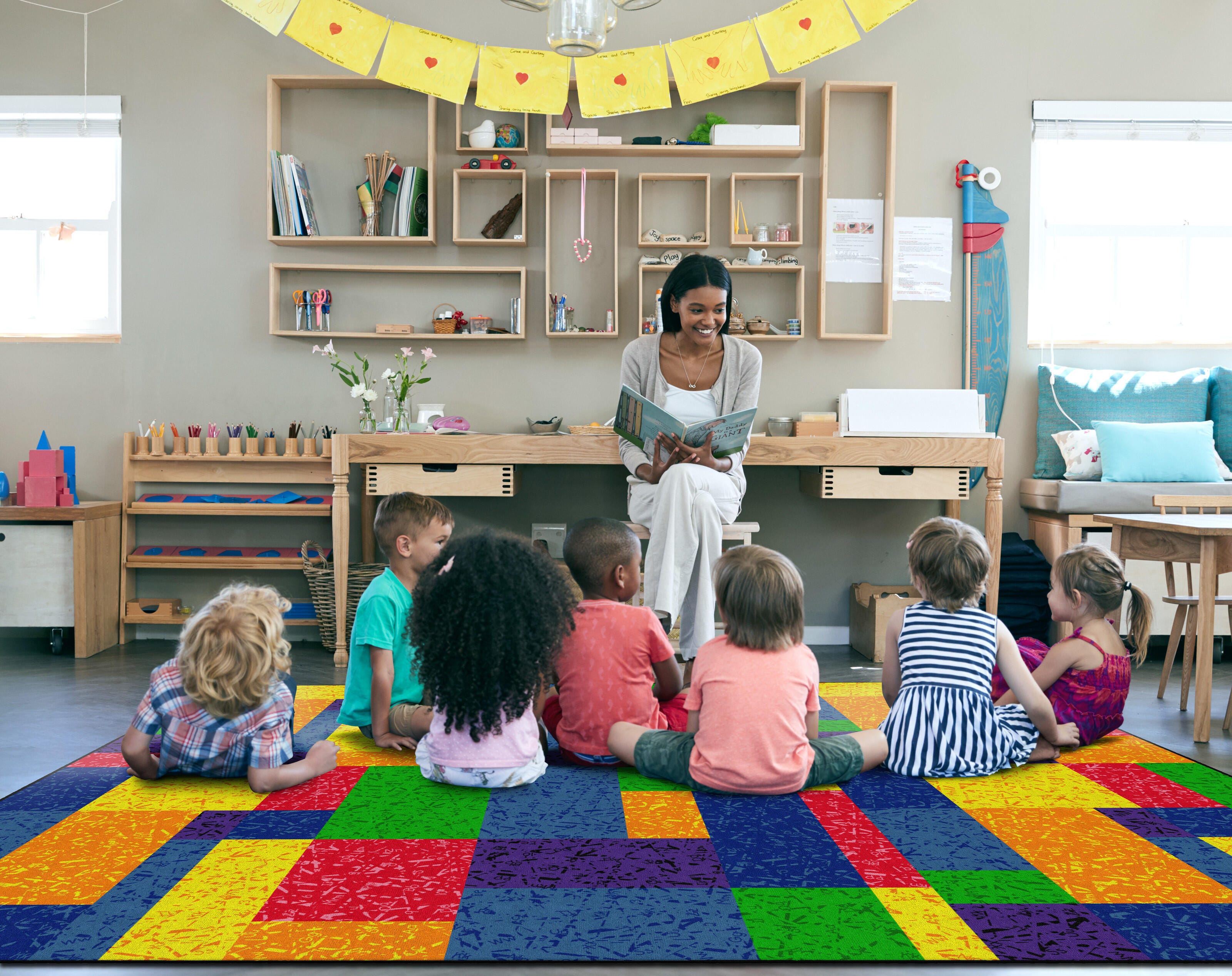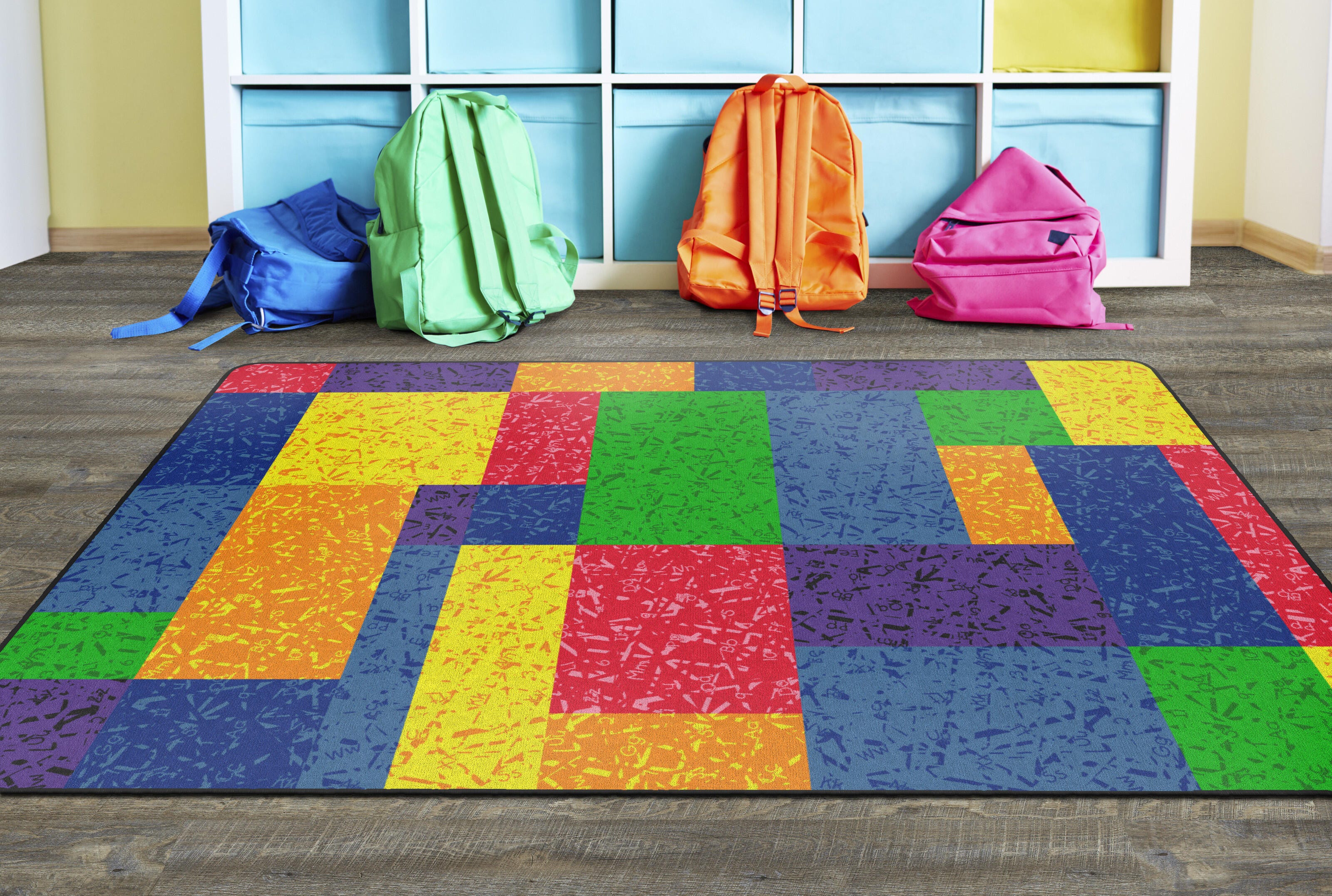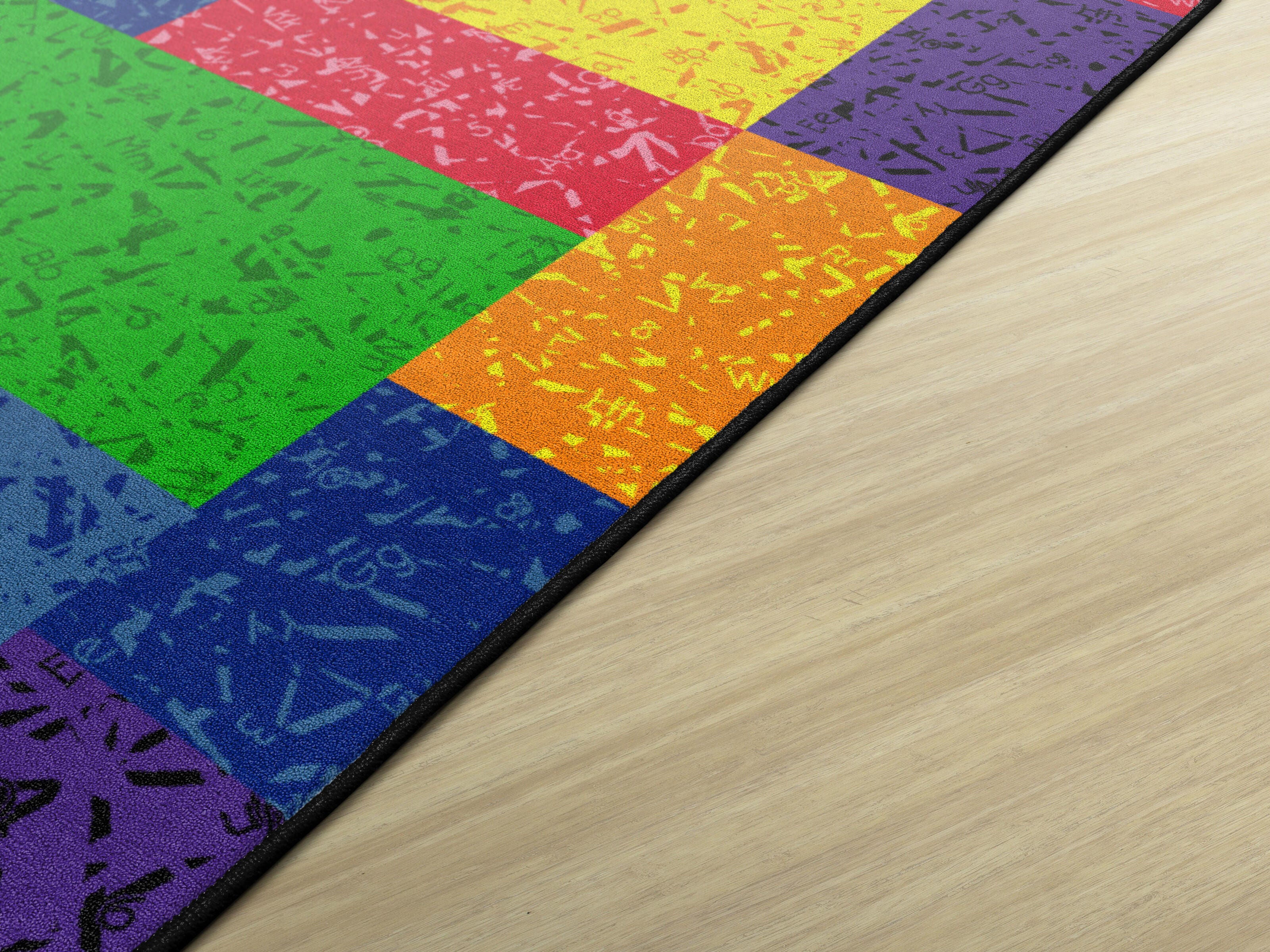 Flagship Carpets Terrific Squares Rectangle Carpet features a unique and interactive design that engages students to find concealed letters and numbers within its surface. Pairs well with high-traffic areas where children of all ages gather - playrooms, classrooms, childcare centers, and preschools. Carpet with antimicrobial protection to inhibit the growth of mildew and bacteria meets all fire code safety requirements. Washable carpets feature skid-resistant backing to prevent slips and trips, and are treated with SCOTCHGARD-PROTECTOR for superior soil resistance and FORCE 5, a permanent anti-microbial agent to guard against odor, mildew, and mold. All Flagship Carpets are CRI Green Label Plus Certified. Backing contains synthetic (SBR) latex for those with latex allergies. Available in several sizes to match your space.Features
