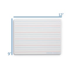 These 2-sided markerboards provide double the fun and function for classroom teaching and student practice work. The front features preprinted loose-leaf-like lines to help kids form letters or write words and sentences; flip to the back and the board is now a magnetic plain white surface for playing with educational magnetic manipulatives (sold separately). Rounded corners and smooth edges make these boards safer and more comfortable for gripping. Non-ghosting dry erase board wipes completely clean every time (leaving no pesky stains or marks behind). Backing is warp and chip resistant. Each mini double-sided board measures 12 L x 9 W x 1/8 D inches. Sold as set of 12.Features