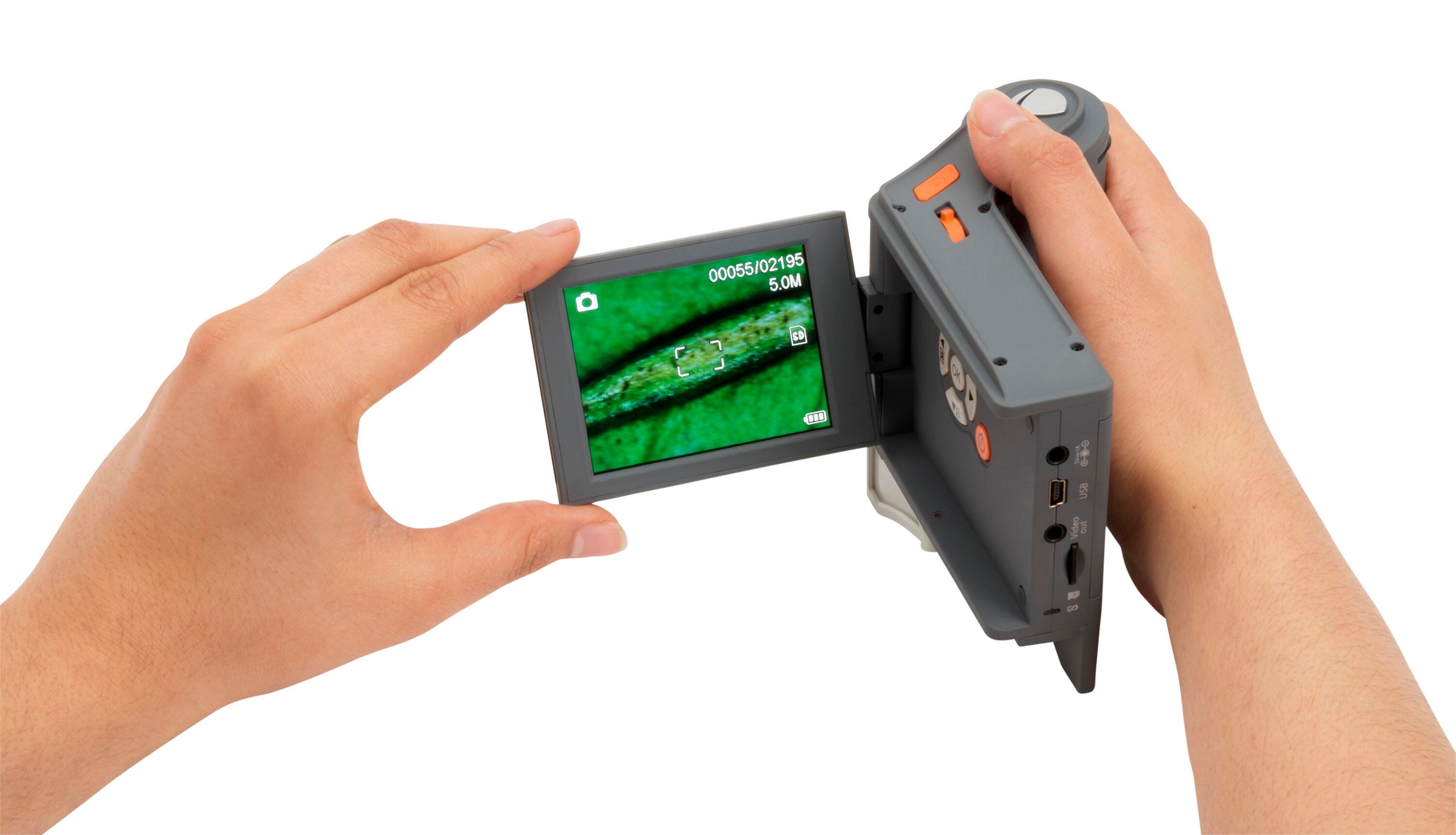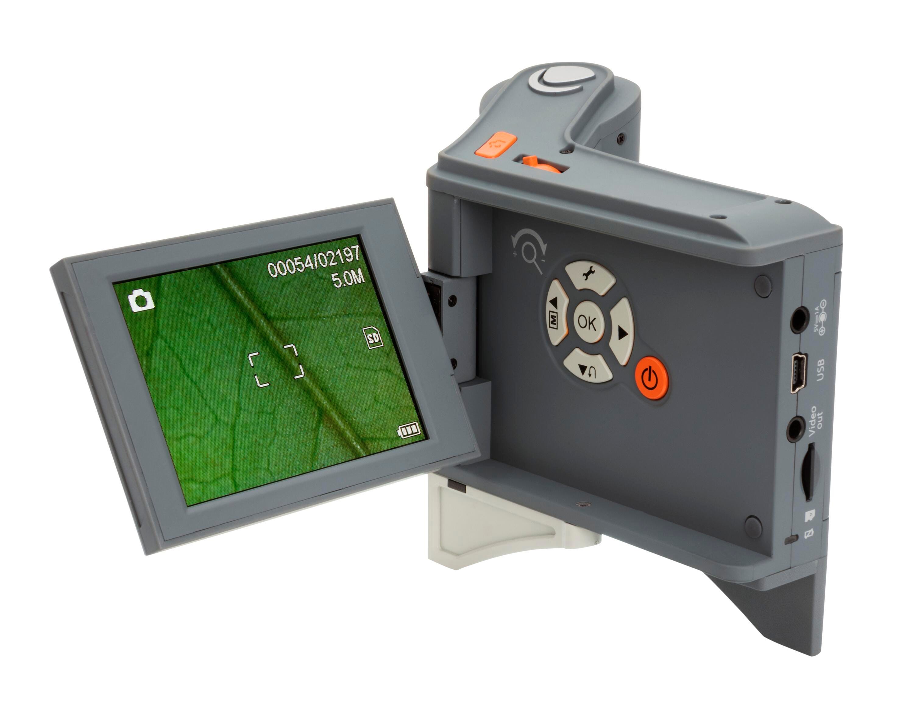 This compact yet powerful digital microscope is the perfect companion for up-close observation on the go. The onboard 3-inch, full color TFT LCD screen flips out when you need it, then folds back into the microscope body for portability. A rechargeable lithium ion battery provides hours of viewing time in the classroom or on a nature walk. FlipView, with its 10x to 120x magnification is a low-power microscope perfectly designed for viewing an array of 3D specimens, from beach sand to bugs, coins and currency, documents, circuit boards, and more. CAPTURE PHOTOS AND VIDEO With its built-in 5 MP sensor, FlipView offers the best resolution you’ll find on a Celestron digital microscope. Combine that with the 5-element IR cut lens, and you’ll achieve sharp images and video of your specimens. A ring of 8 adjustable LEDs provides the perfect illumination for your shot. Insert any Micro SD card (up to 32 GB) to save images and videos, or plug the microscope into your computer via the included USB cable and capture images using Celestron’s Portable Capture Pro software. Or stream the view from FlipView to a television or projector with the included video out cable. 3 WAYS TO OBSERVE With one of Celestron’s most versatile designs, FlipView can be used in three configurations depending on the specimen you’re viewing: Use it in handheld mode for quick and easy observations. Flip out the attached leg and FlipView sits on any flat surface. Perfect for viewing flat objects like stamps, currency, and more. For longer observing sessions of 3D objects, mount FlipView to the included metal stand via the ¼-20 connector. The stand features two articulation points and can be adjusted to point it precisely at your subject.Features