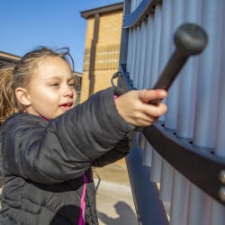 The graceful lines and sculptural silhouette of this playground Harp add unparalleled beauty to any outdoor space. As users sweep both mallets across all 11 bright and sustaining chimes, gentle, soothing, angelic sounds can be heard, bringing joy to all listeners. The upright design invites players to create beautiful music from both sides.Features
