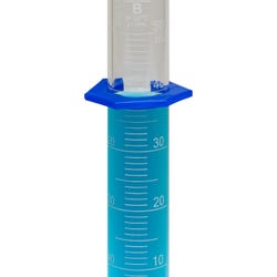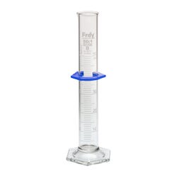 This graduated cylinder from Frey Scientific complies with ASTM E1272, Class B standards for general-purpose lab use. The cylinder is calibrated to contain and has a double metric scale, a 50 mL capacity, and 1 mL graduations. This borosilicate glass cylinder features a pour spout, heavy uniform wall tubing, and an attached glass hexagonal base. It includes a bumper guard to prevent accidental breakage.Features