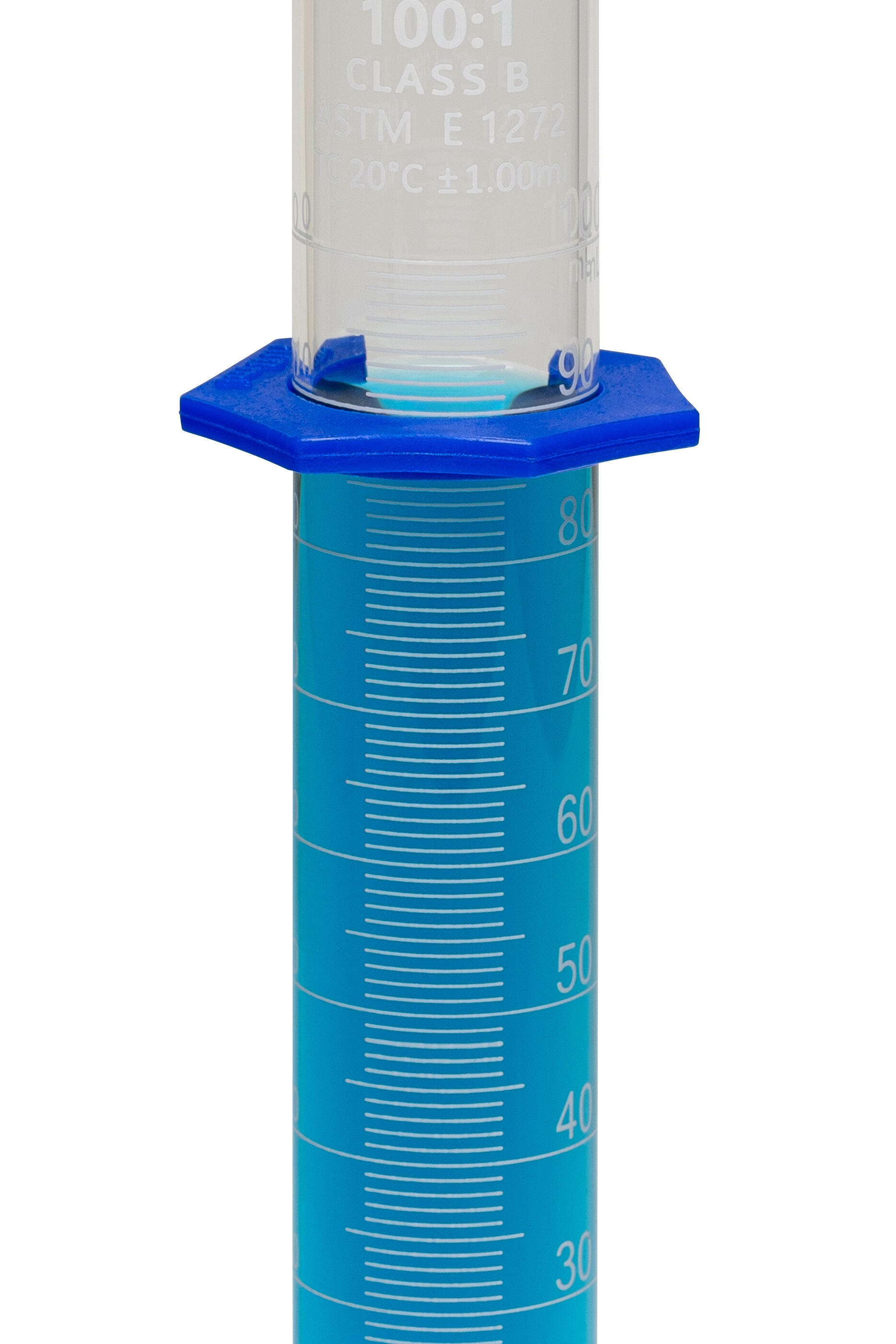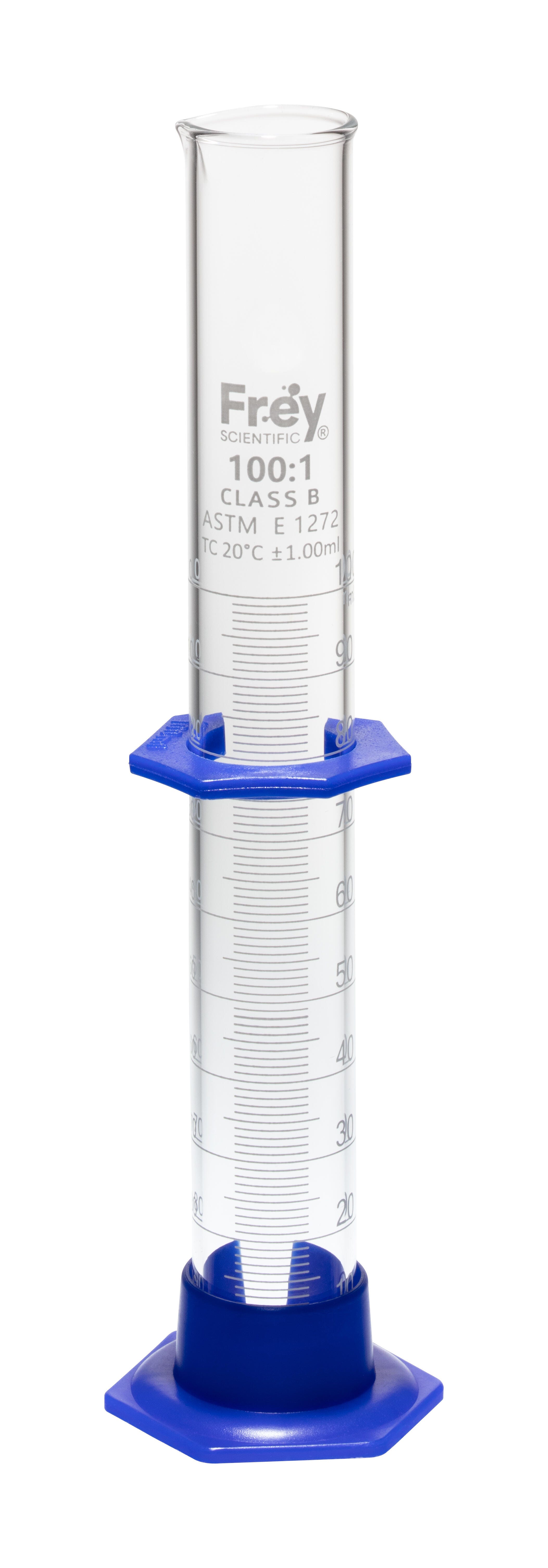 These graduated cylinders from Frey Scientific comply with ASTM E1272, Class B standards for general purpose lab use. Each cylinder is calibrated to contain and has a double metric scale, a 100 mL capacity, and 1 mL graduations. The borosilicate glass cylinders features a pour spout, heavy uniform wall tubing, and plastic hexagonal bases. They include bumper guards to prevent accidental breakage.Features