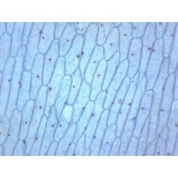 This prepared microscope slide displays the epidermal cells of Allium cepa (onion). This flat mount specimen shows typical plant cells with nuclei, cytoplasm, and cell walls.Features