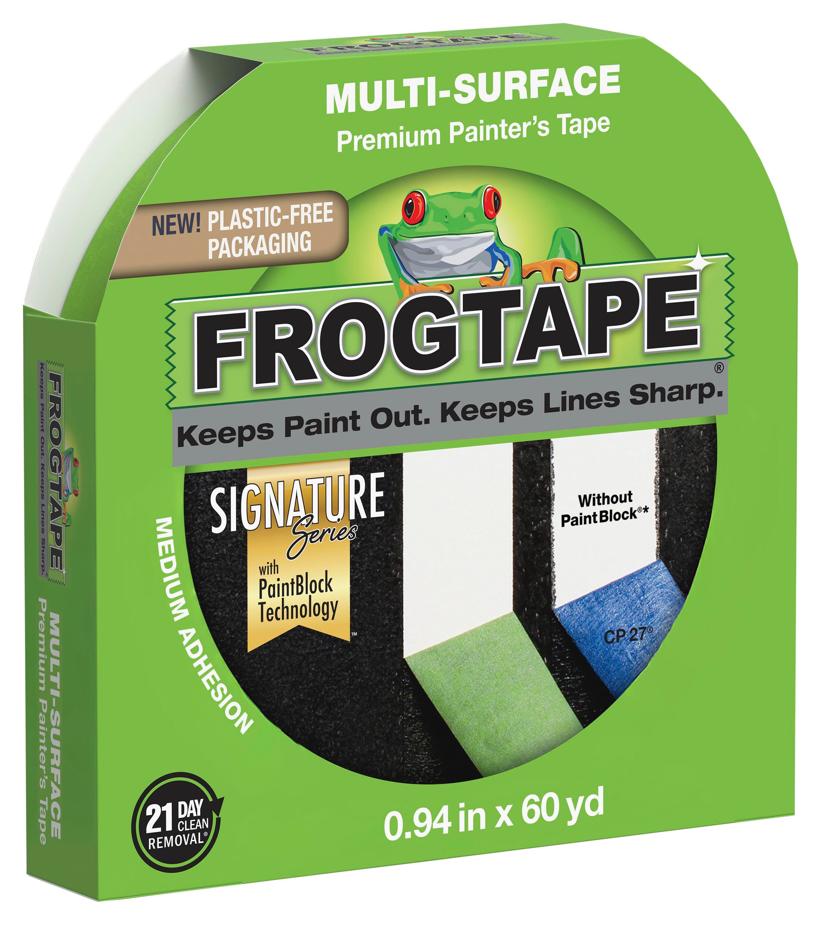 Get clean lines on your next painting project with Frog Tape Multi-Surface Painter’s Tape. It’s made with exclusive PaintBlock Technology, a super-absorbent polymer that reacts with the water in latex paint and instantly gels to form a micro-barrier that seals the edges of the tape to prevent paint bleed. The result is a crisp, professional paint line. Premium grade masking tape delivers a performance you can be proud of.Features