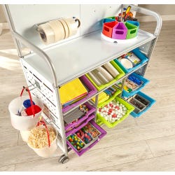 The STEM Lab Makerspace Cart includes everything needed to set up a makerspace in a classroom, STEM lab or library. Easy rolling, durable, metal cart comes already fully loaded with over 95 unique components: building materials, Strictly Briks®, craft supplies, electrical components, and tools perfectly organized to be easily accessible to middle school students. Also included are 72 Task Cards featuring open-ended, teacher-developed activities that span a variety of STEM concepts and appeal to children’s unique interests and learning styles and a teacher's guide. Activities are NGSS-aligned. Cart measures 61 x 40 x 17 inches and each drawer contains organizers to keep the included materials easy to find and use. Additional organization tools include two pegboards with moveable single and double hooks, buckets, a tape bar, spinning organizer with dividers, and hook magnets. The top portion of the cart serves double duty as both a magnetic surface and a dry-erase white board.Features
