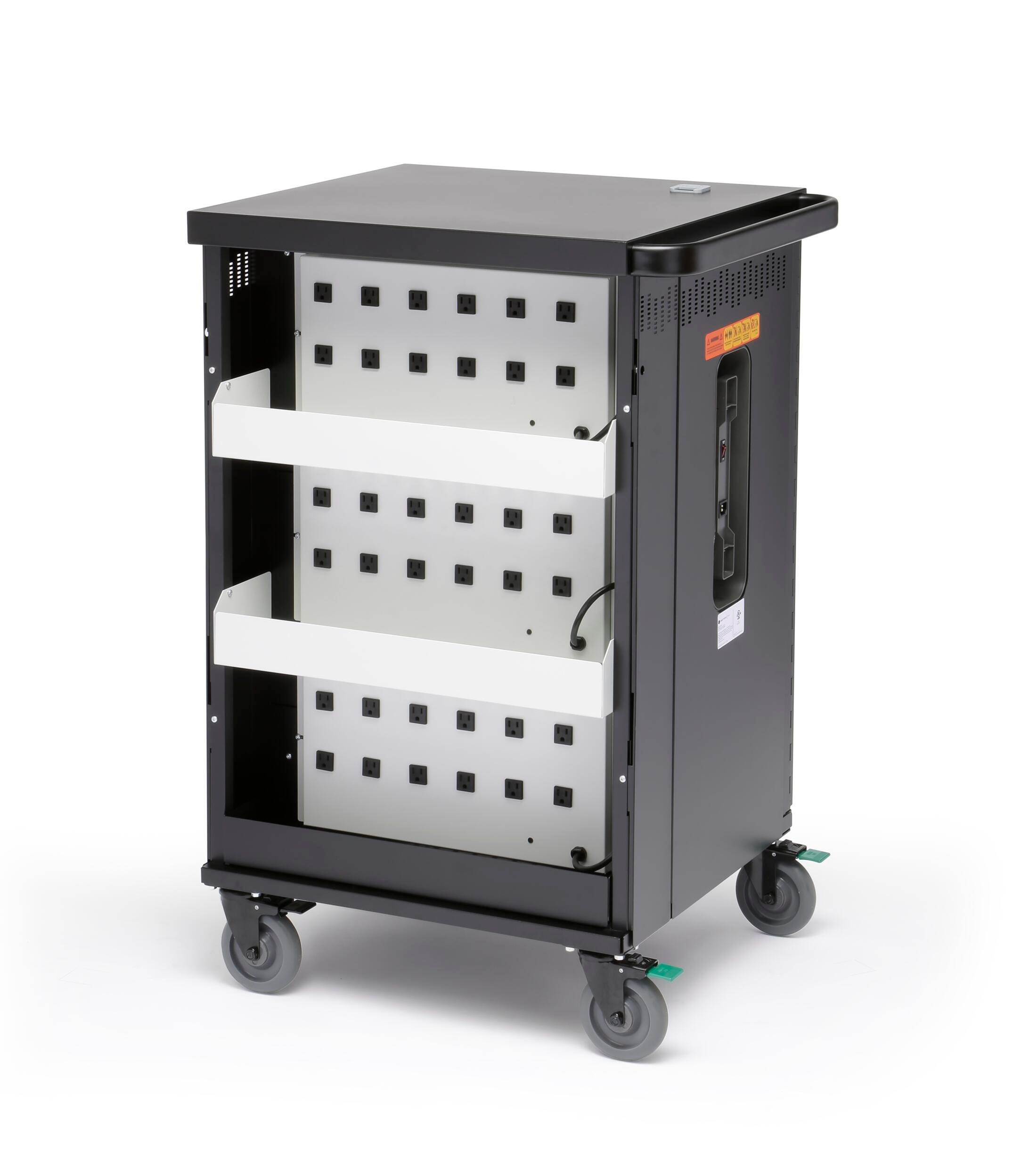 Support large technology initiatives with secure charging throughout your building, facility, or campus. Offered with two or three shelves to support from 24 to 36 devices. Slot numbering bars allow for device organization and management. Digital Timer system assures devices are charged quickly with one cord from cart to wall outlet. Top of the cart provides a work surface and courtesy power for a laptop or other accessory up to 8 pounds.Adjustable dividers allow modification of slot size from 1.25? to 1.5? to support various sizes of devices and numbering bars keep devices organized. Cart is designed and certified for safety, and the lock and sturdy solid steel construction keep devices secure. Directional locking casters allow for maximum control during transport and offset locks protect walls and doorframes.