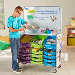 The STEM Lab Makerspace Cart includes everything needed to set up a makerspace in a classroom, STEM lab or library. Easy rolling, durable, metal cart comes already fully loaded with over 95 unique components: building materials, Strictly Briks®, craft supplies, electrical components, and tools perfectly organized to be easily accessible to elementary school students. Also included are 72 Task Cards featuring open-ended, teacher-developed activities that span a variety of STEM concepts and appeal to children’s unique interests and learning styles and a teacher's guide. Activities are NGSS-aligned. Cart measures 61 x 40 x 17 inches and each drawer contains organizers to keep the included materials easy to find and use. Additional organization tools include two pegboards with moveable single and double hooks, buckets, a tape bar, spinning organizer with dividers, and hook magnets. The top portion of the cart serves double duty as both a magnetic surface and a dry-erase white board.Features