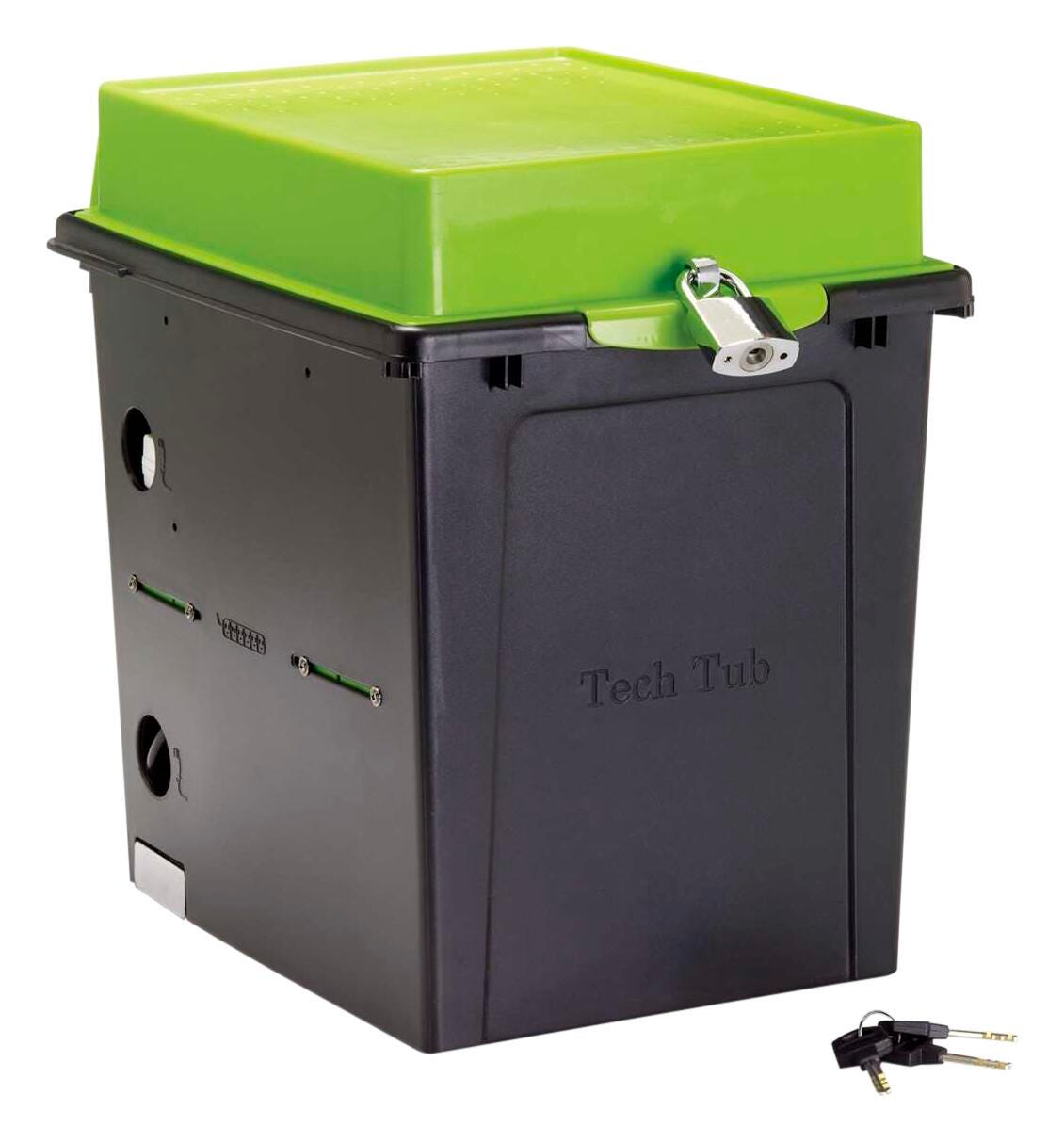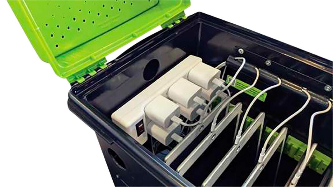 This Tech Tub has all the features of the premium models, including a padlock for securing the devices inside. The only difference is there is no locking block and pin to secure the tub to surfaces. It has the capability to charge up to 6 iPads. It makes sharing small sets of devices easy within a classroom or throughout a school. Adjustable dividers can accommodate most cases and the side cable channel helps keep cords neat, tidy and lined up with each device.Features