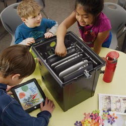 This new mid-range, top-loading Tech Tub has all the features of the premium models, including a padlock for securing the devices inside. The only difference is there is no locking block and pin to secure the tub to surfaces. Tech Tub Standard has the capability to charge up to 6 Chromebooks, iPads, or other tablets. It makes sharing small sets of devices easy within a classroom or throughout a school. Adjustable dividers can accommodate most cases and the side cable channel helps keep cords neat, tidy, and lined up with each device. Made from highly durable heat-resistant ABS plastic and is vented to ensure airflow. Please note, this Tech Tub is not compatible with 8th Generation iPads. For an iPad 8 charging solution, please purchase item# 2087826.Features