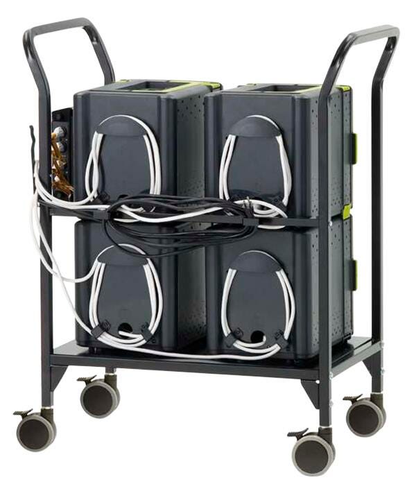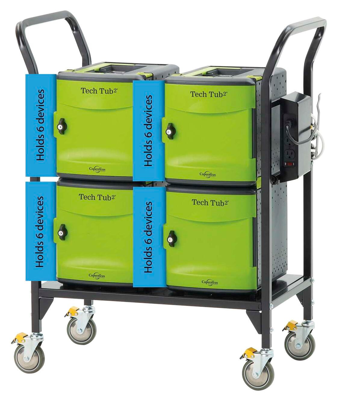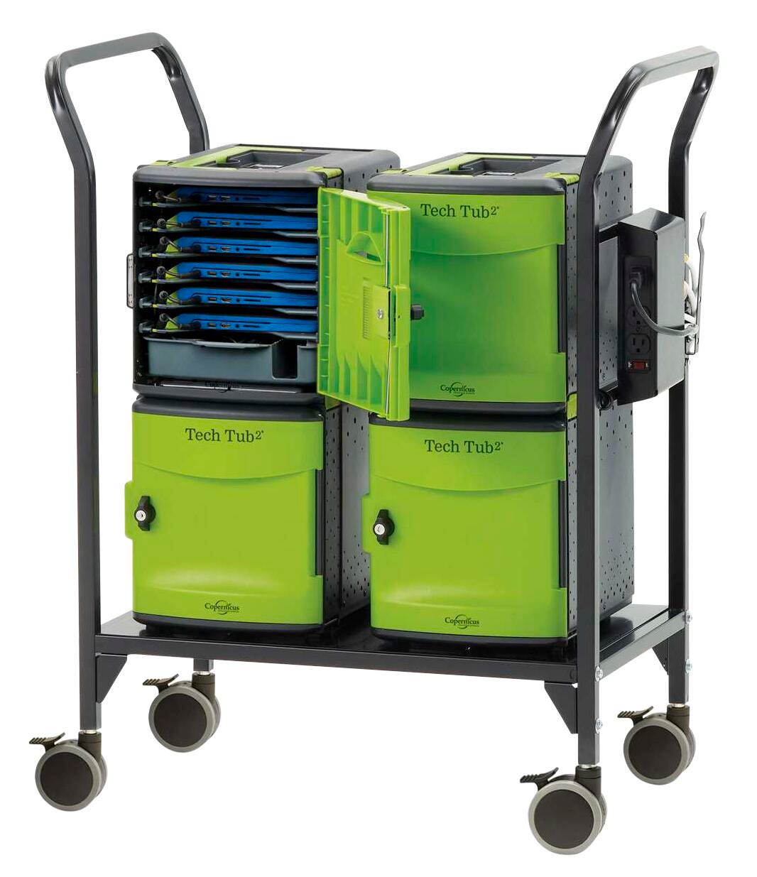 Cart holds 4 Premium Tech Tub2, which can charge and store up to 24 devices. The cart is sturdy with two handles for ease of mobility. With a tub-to-tub locking mechanism, the tubs lock together securing all the devices in the cart. Features 3-point door lock with 2 keys, cable management on back, 3-inch locking casters, power timer for charging (requires 1 outlet). An additional model with USB hubs that syncs and charges iPads (SKU 1566456). Measures 34 x 19 x 43 inches.Please note, this Tech Tub is not compatible with 8th Generation iPads. For an iPad 8 charging solution, please purchase item# 2087828