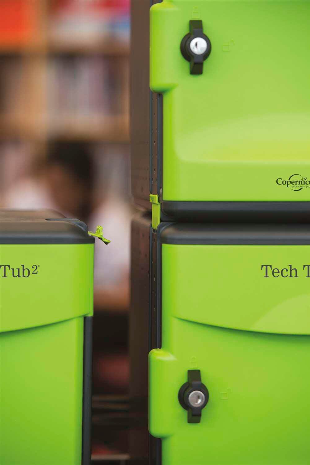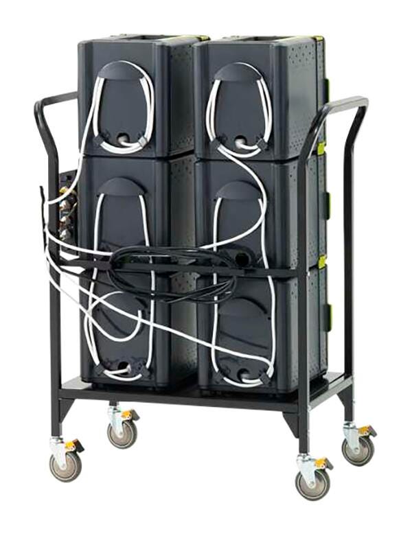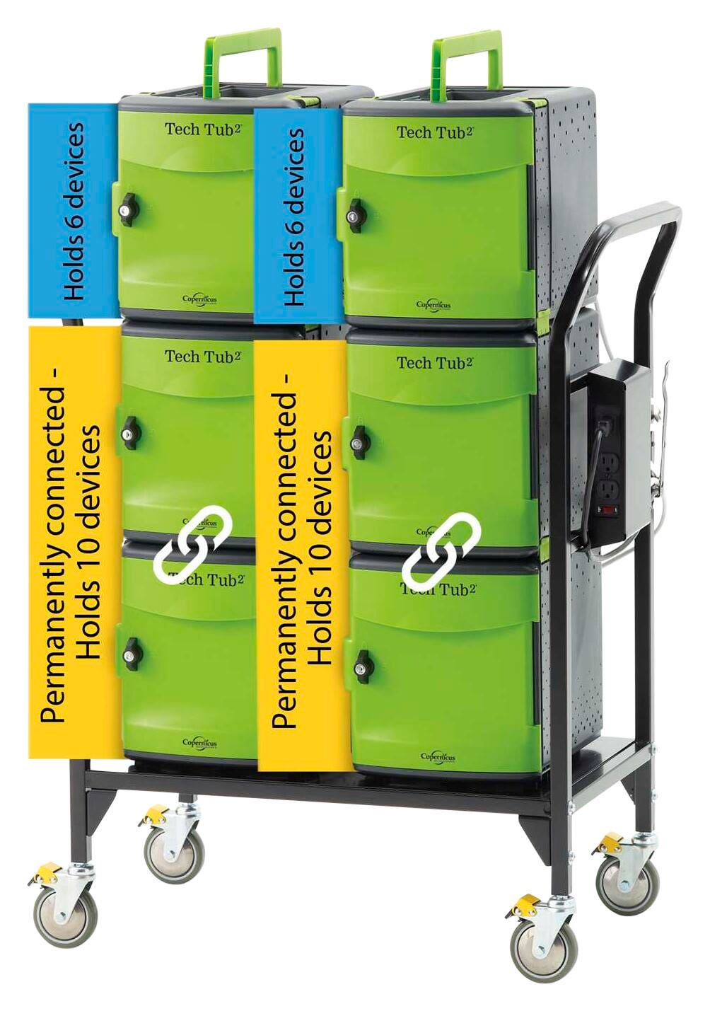 This lightweight cart features two handles and moves effortlessly over thresholds. It can charge and store up to 32 devices. The lower tub sets are permanently connected together and the top tubs break apart using clips. Crafted with a 3-point door lock with 2 keys (for each tub), cable management on the back, 3-inch locking casters, and a power timer for charging (requires 1 outlet). An additional model with USB hubs that syncs and charges iPads (SKU 1566458). Please note, this Tech Tub is not compatible with 8th Generation iPads. For an iPad 8 charging solution, please purchase item# 2087827.