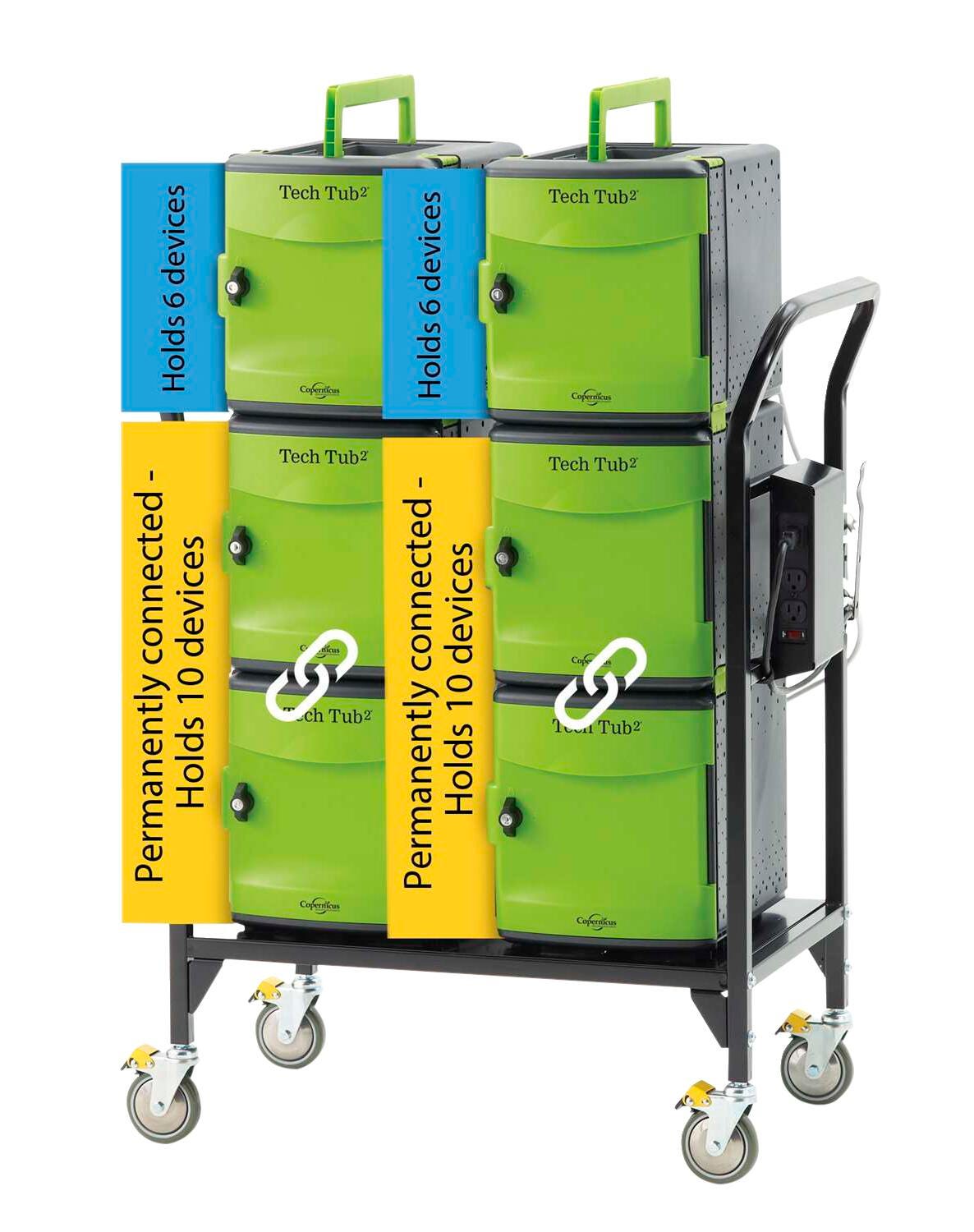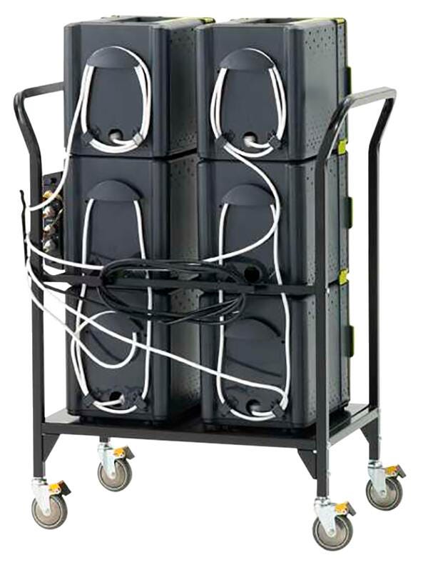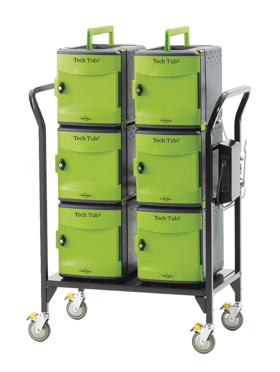 This lightweight cart features two handles and moves effortlessly over thresholds. It can charge and store up to 32 devices. The lower tub sets are permanently connected together and the top tubs break apart using clips. Crafted with a 3-point door lock with 2 keys (for each tub), cable management on the back, 3-inch locking casters, and a power timer for charging (requires 1 outlet). The USB hub syncs and charges iPads.Not compatible with the iPad with USB-C 20w adapter. Check compatibility for all other devices.