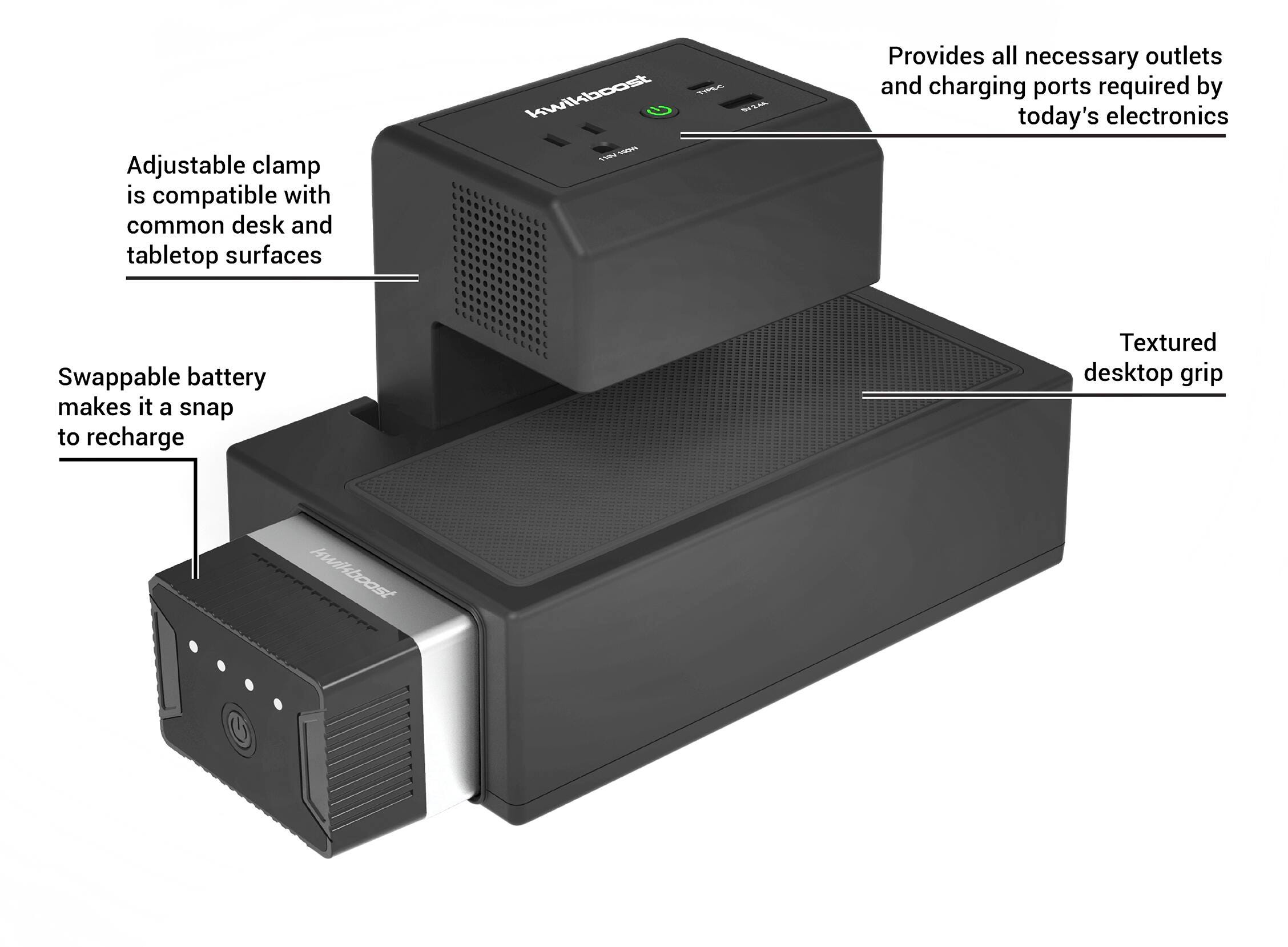 Enjoy convenient cordless charging of mobile devices. The KwikBoost EdgePower desktop charging station system is a total solution for laptops and mobile devices in workspace and classroom environments. EdgePower eliminates extension cords by putting power right where you need it. The EdgePower Clamp-On Desktop Charging Unit features an innovative design that easily attaches to most tables and desktops. Once connected, it offers a standard AC outlet, a USB-A charging port, and a USB-C PD charging port. When loaded with a freshly recharged EdgePower rechargeable battery, you have enough power to charge a typical laptop up to 2 times, a standard Chromebook or tablet up to 4 times, and an average smartphone up to 14 times. The Charging Unit can also charge a laptop and 2 mobile devices simultaneously.