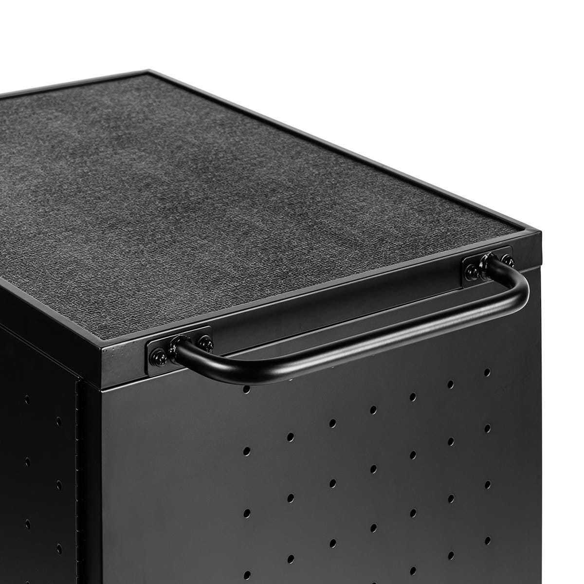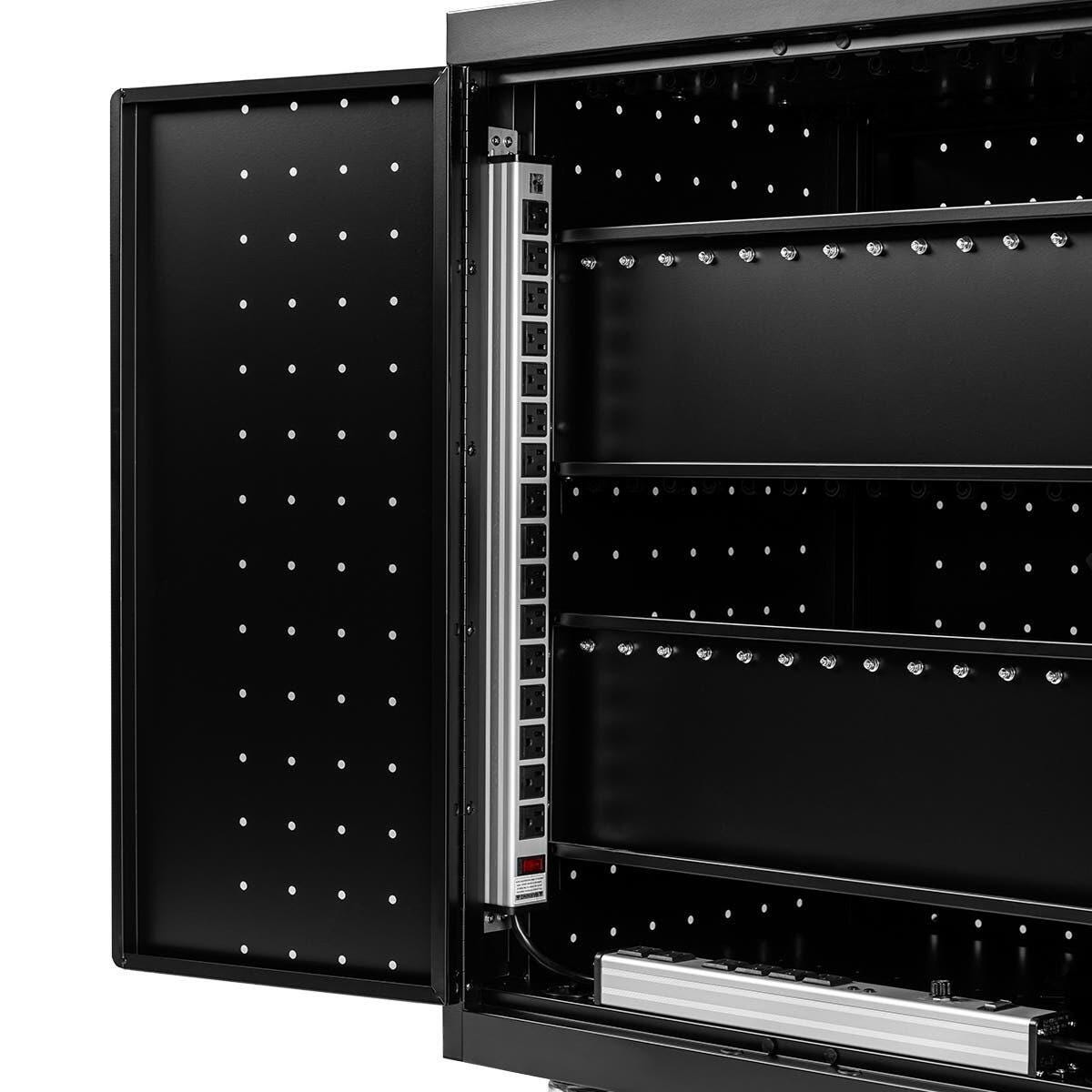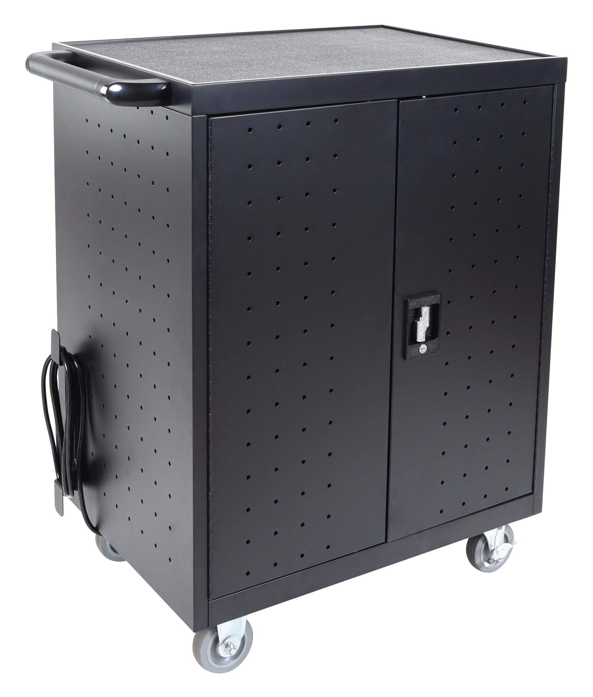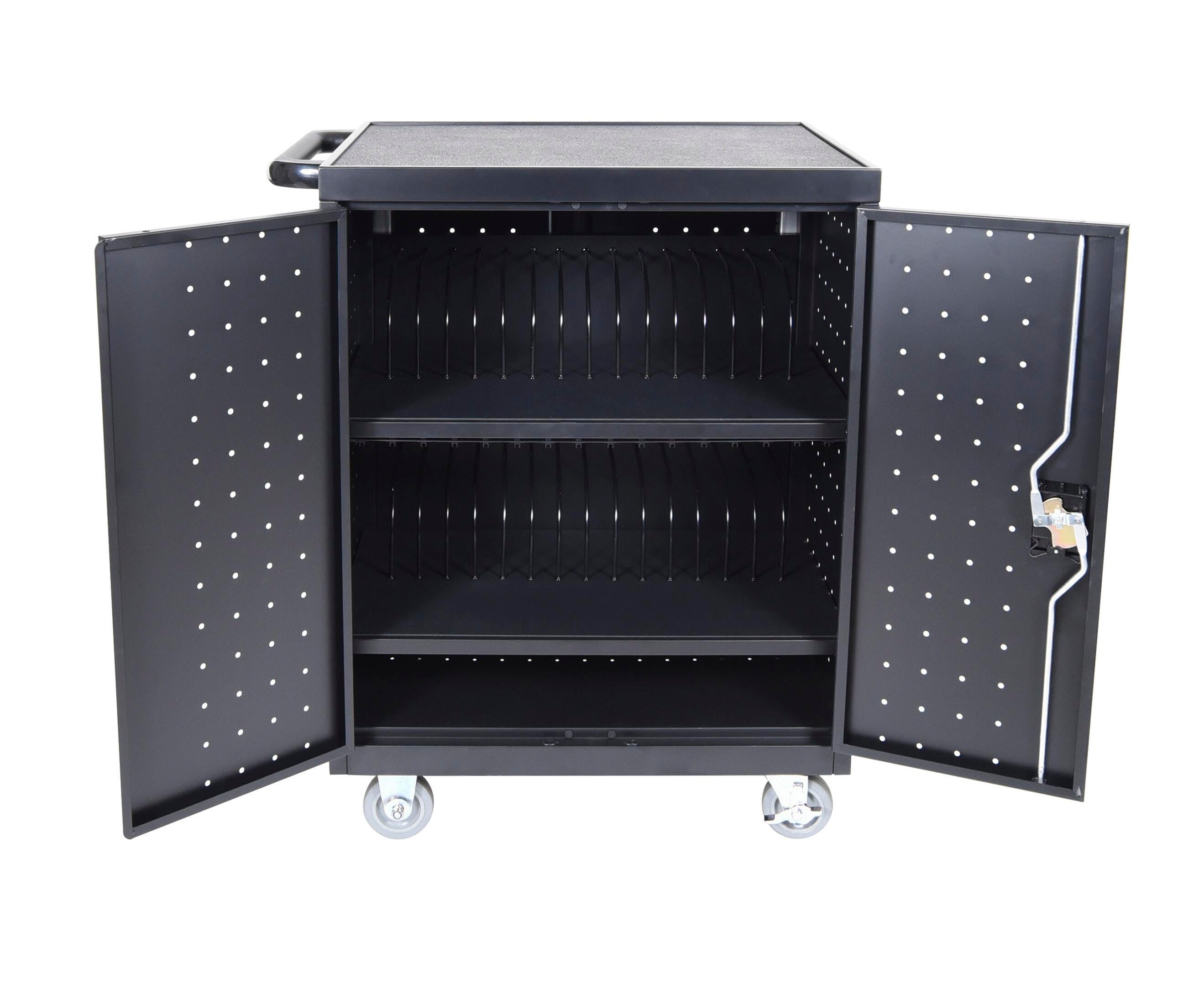 This durable and energy efficient cart includes a timer that alternates between two 16-outlet power strips, so you can charge in stages without overloading circuits or blowing a fuse. When in transit, your laptops wheel from one room to the next with sturdy 4 inch non-skid casters. Devices remain in place while resting in between rubber-coated steel dividers on rubber matted shelves. If not in use, store the cart safely by locking the two key-lock doors. Eliminate the unnecessary hassle of charging and storing multiple devices with this dependable laptop charging cart. Fits almost any standard laptop and Chromebook (up to 17 inch displays).