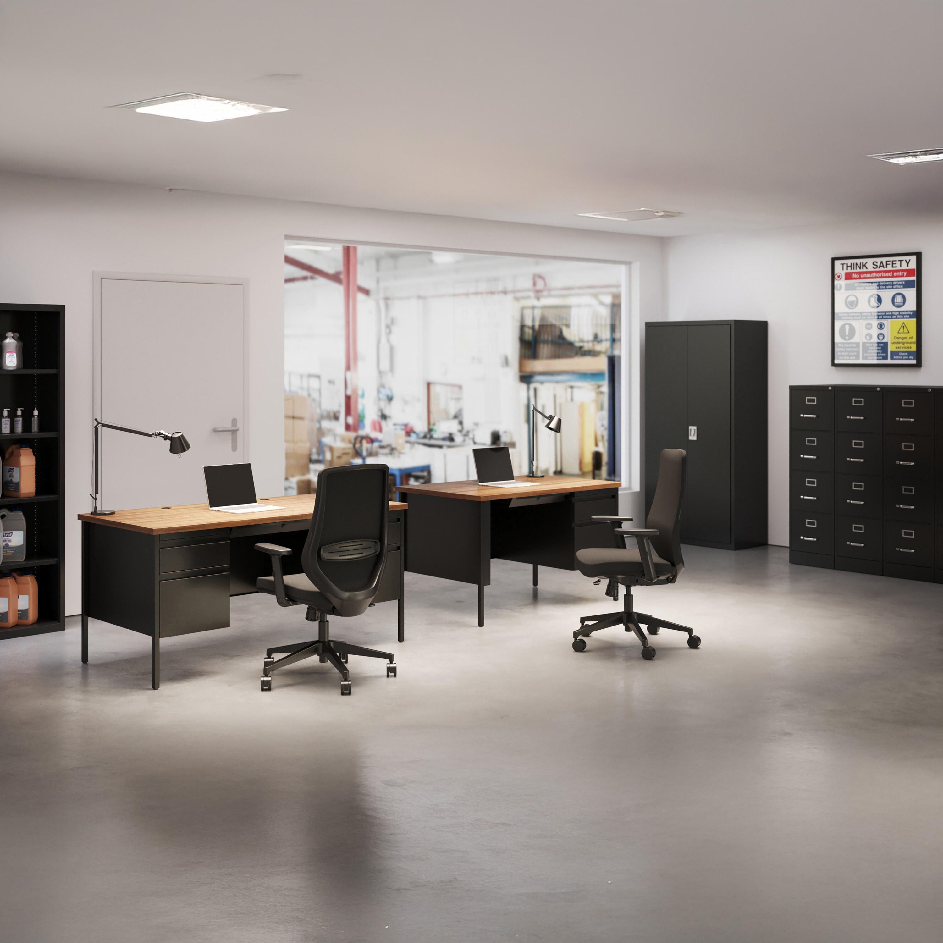 Designed with locking doors in filing cabinet and center desk drawer for secure storage when desk is unoccupied