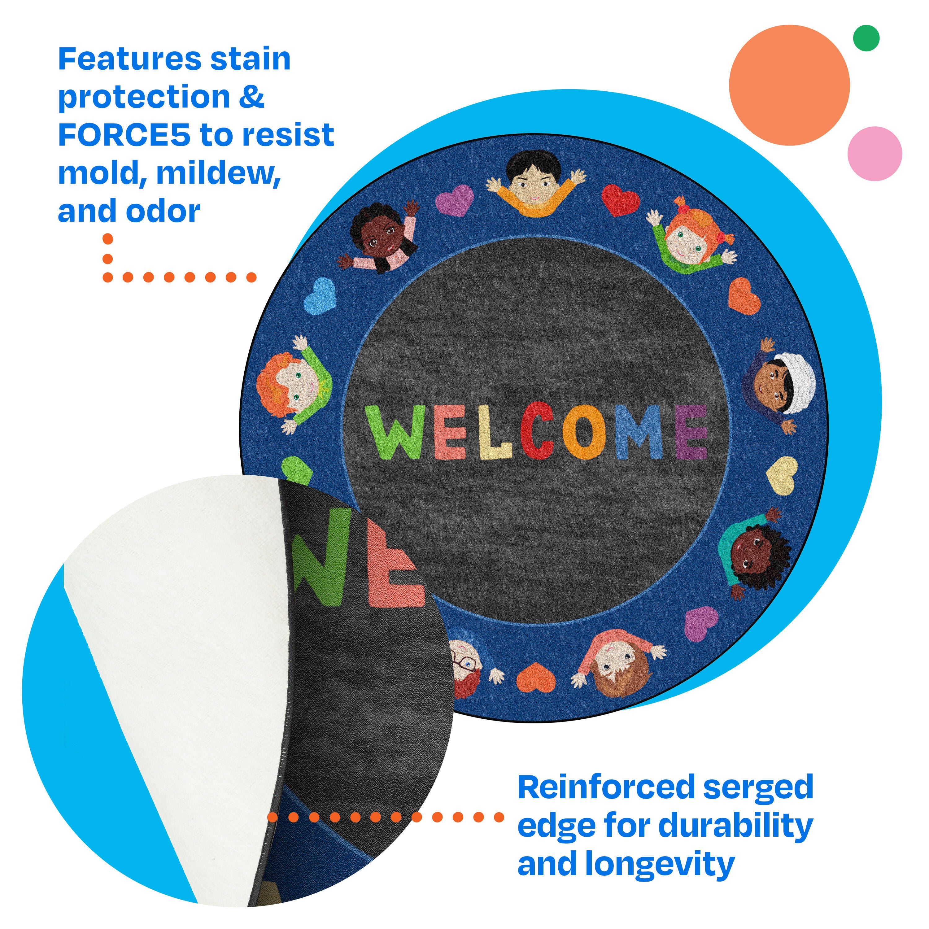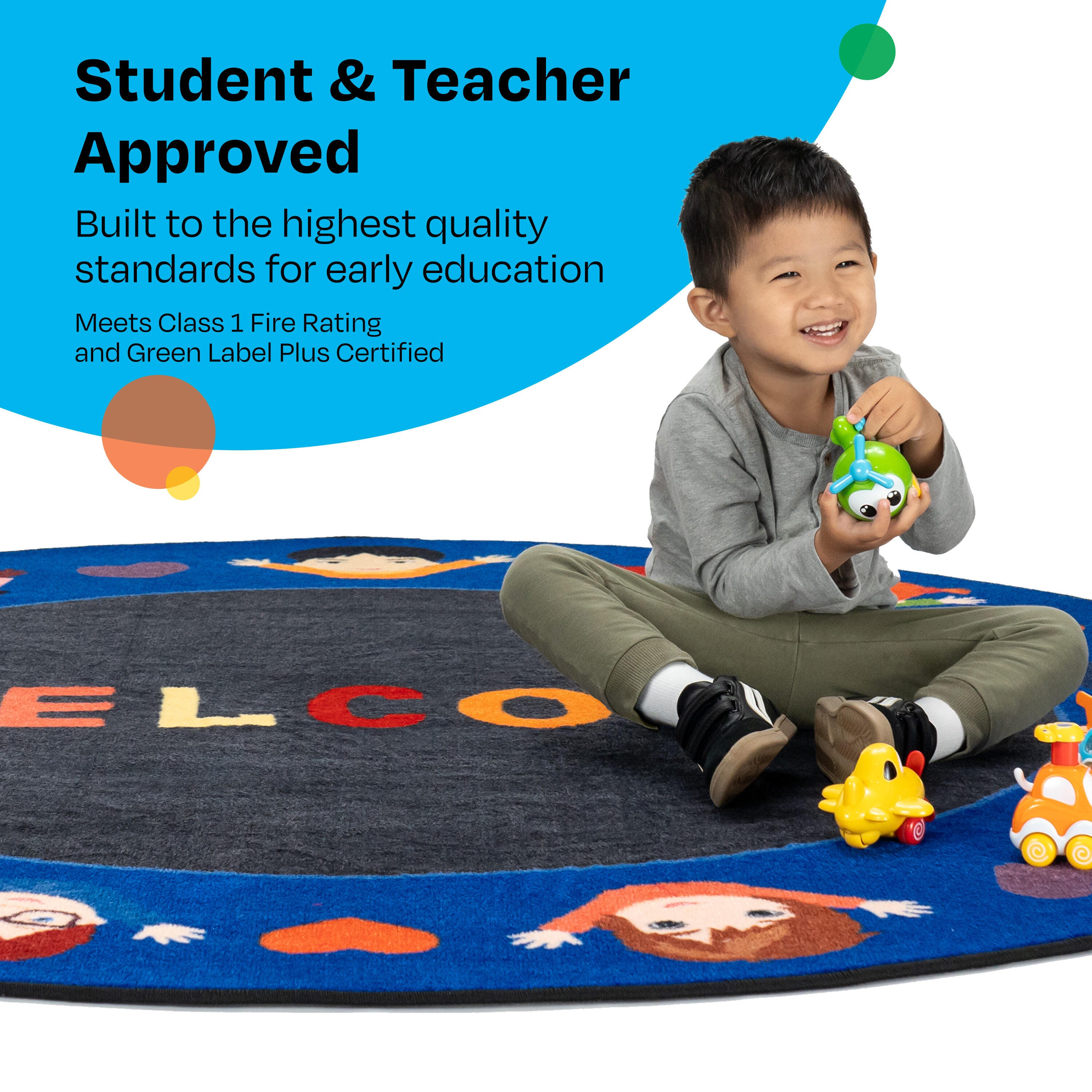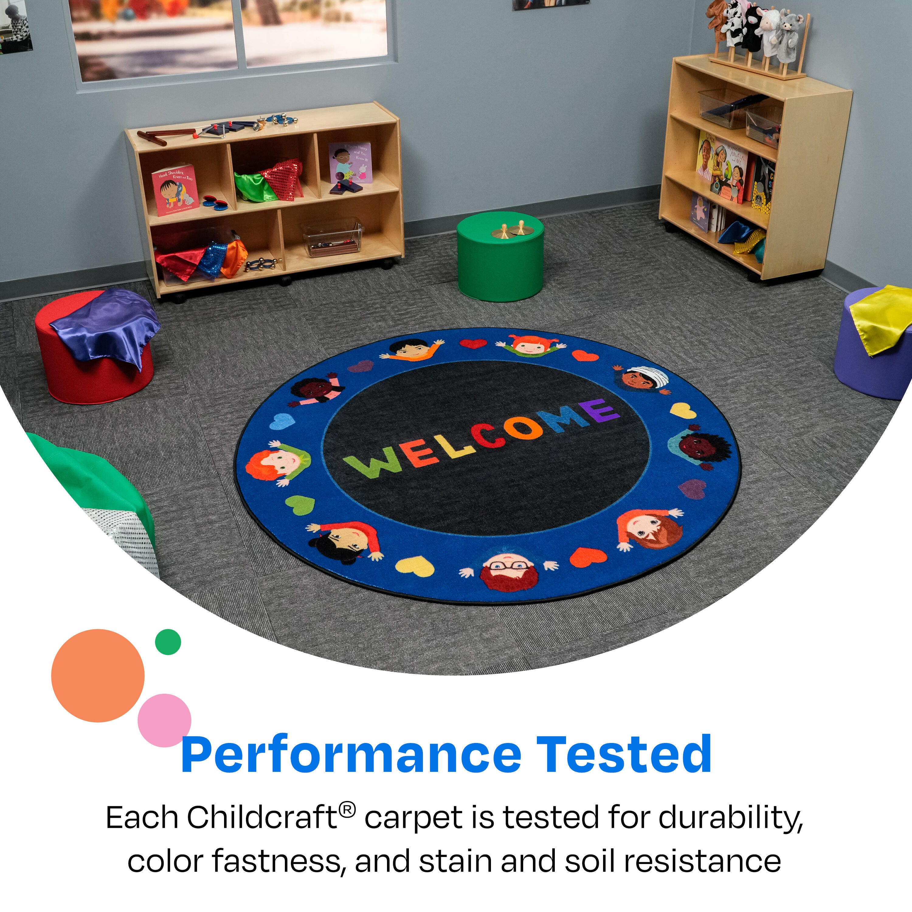 This Childcraft® Welcome Friends Carpet comes in a round shape for morning circle time, group lessons, reading, and more. The classroom carpet features a variety of children reflecting all types of children seen in early childhood classrooms. Our round carpet is made of high-quality materials to create a comfortable and durable space for young students. Each Childcraft carpet is performance-tested for durability, color fastness, and stain and soil resistance for quality you can trust. The Green Label Plus Certification also helps ensure the best indoor quality for a safe and healthy environment all year long.