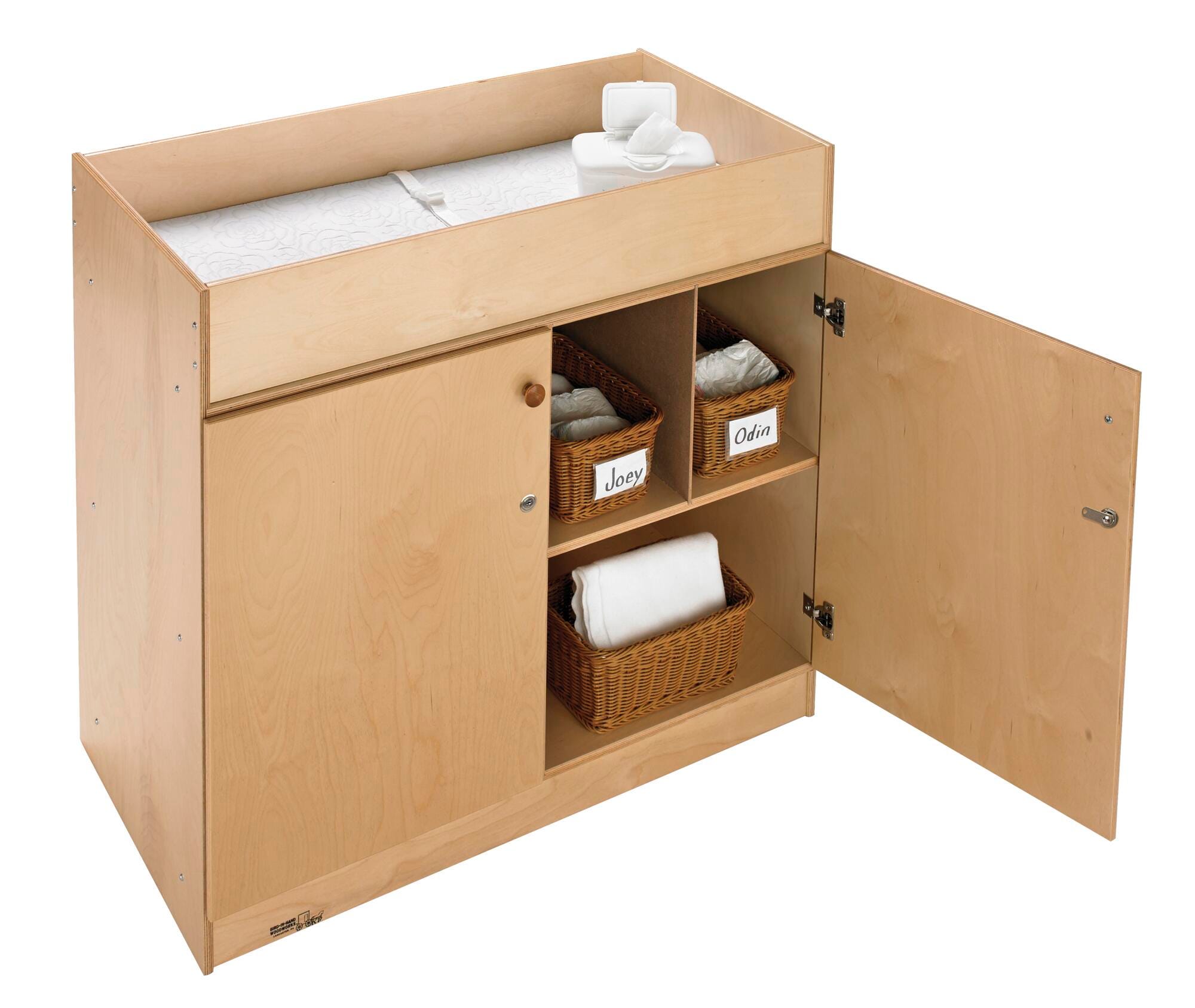 Childcraft® Changing Table with Locking Doors provides a safe and convenient diaper-changing solution with built-in storage for essential supplies. The spacious changing surface includes a comfortable, easy-to-clean 1-inch thick changing pad, while the double locking doors below keep wipes, diapers, and other necessities neatly stored yet easily accessible. Built-in dividers allow for organized storage, creating individual cubbies for different supplies or children’s items. Made from high-quality birch plywood with a durable UV-cured acrylic finish, this changing table is designed for long-lasting use. The unit measures 40 W x 20-3/4 D x 36 H inches.Features
