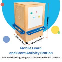 Childcraft® Mobile Learn and Store Activity Station features two magnetic dry erase boards, one whiteboard, one wooden pegboard, inner storage shelves, and outer plastic trays. Easy to use, store, and clean, the four-sided easel has heavy-duty locking caster wheels to move easily from room to room. Use the multi-functional arts and crafts stand for preschools, elementary schools, early childhood programs, child development centers, and headstart centers. This unit comes assembled and can accommodate four children at once. The rolling unit measures 25-1/2 W x 25-1/2 D x 42 H inches.Features