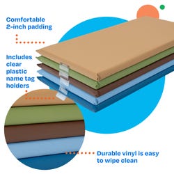 Childcraft® Rainbow Rest Mats for classrooms are the perfect solution for naptime and relaxation. Each mat is padded and easy to wipe clean, combining comfort and durability for students and teachers. The sleeping mat is made using radio frequency vinyl welding technology to seal all seams and protect the foam padding from liquid and bacteria. Wipe clean to disinfect after each use. This set includes 5 fun colors in earthtone shades of brown, blue, and green. Each sleeping pad includes a clear nametag holder and is lightweight and simple to take out/put away. Measures 48 L x 24 W x 2 H inches and comes in a pack of 5.Features