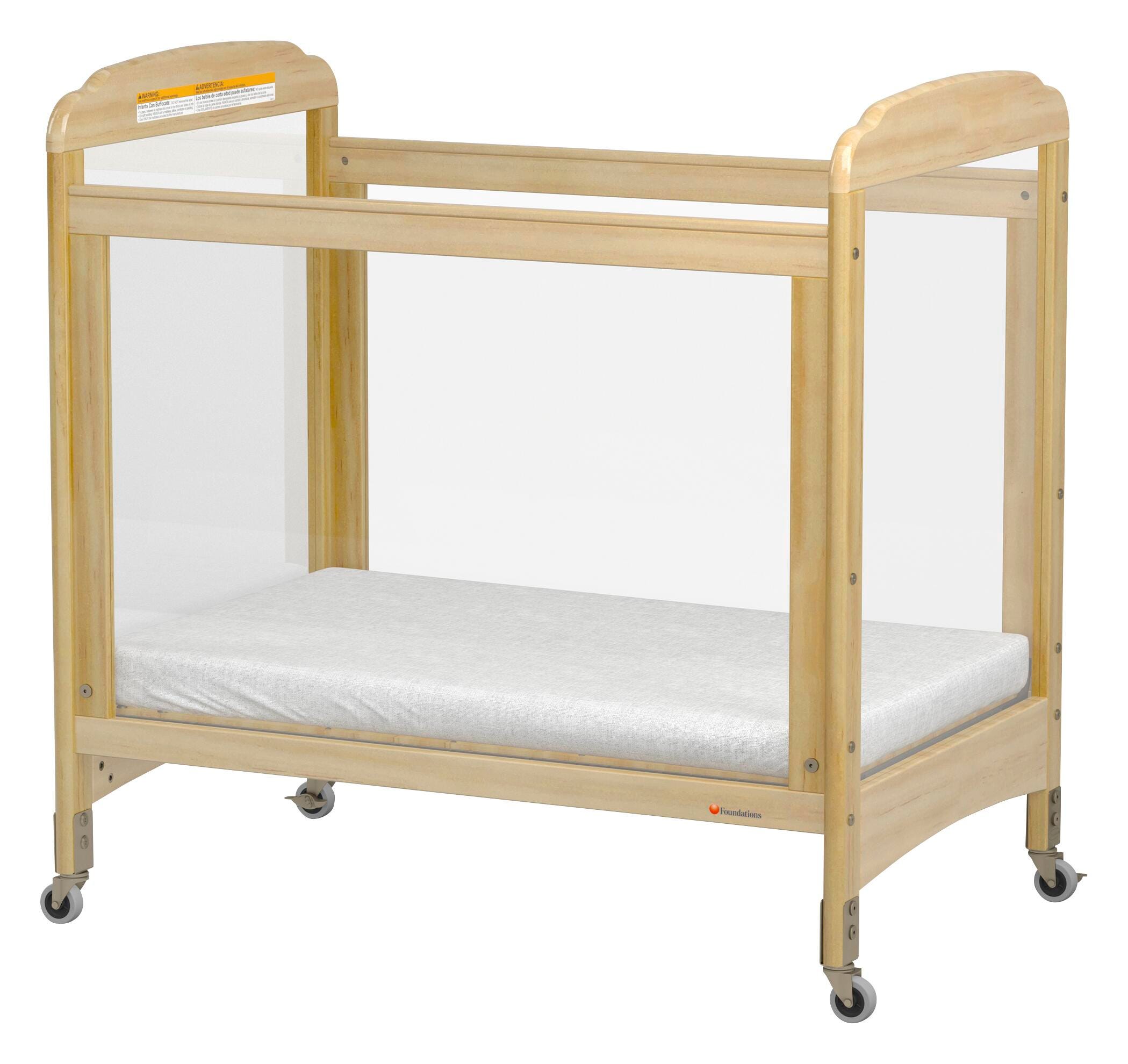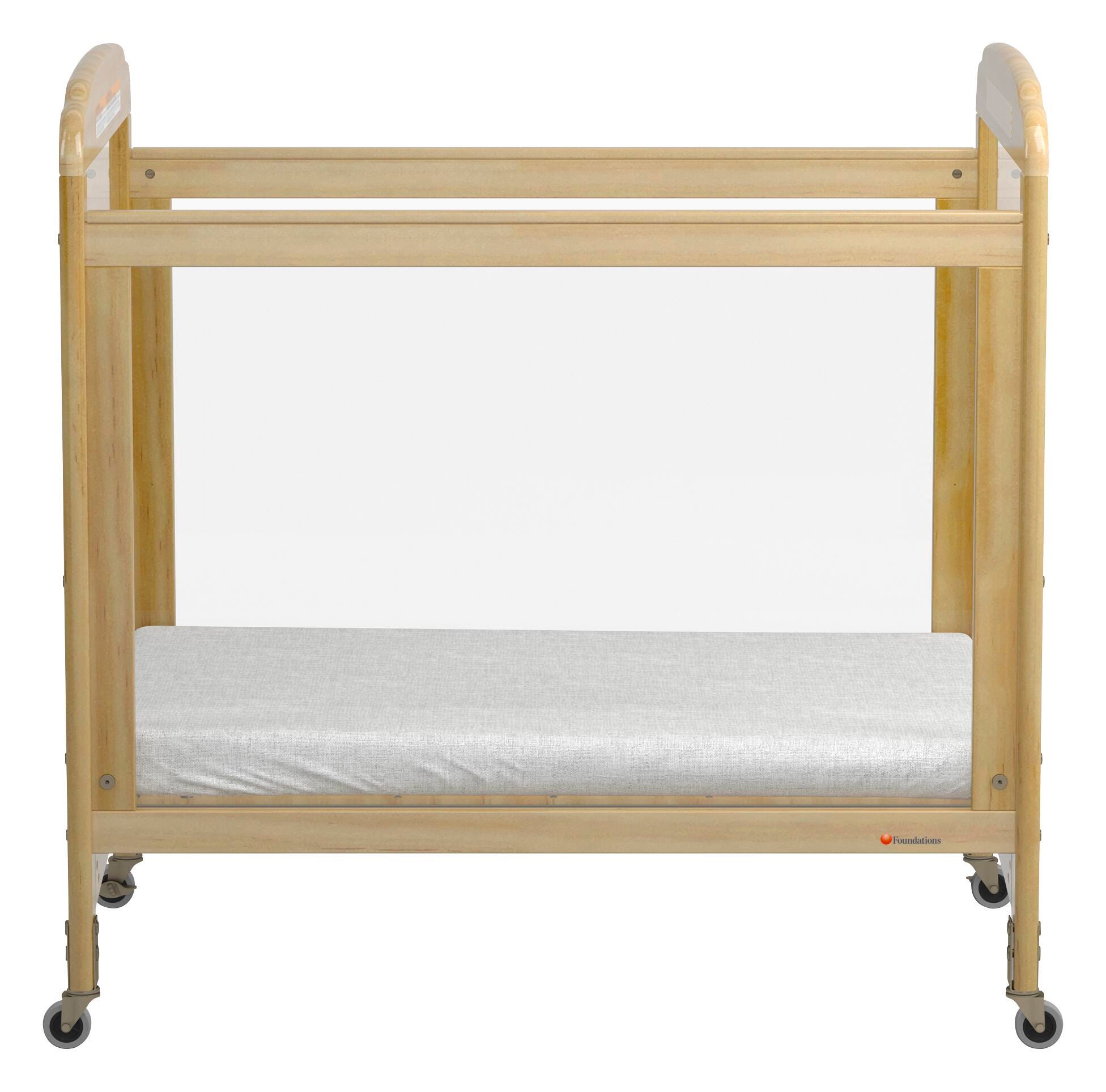 Create a safe and serene sleep space for infants with the Foundations Serenity 4-Panel ClearView Fixed-Side Compact Crib. Designed for commercial childcare environments, this durable crib features a natural wood finish and four clear-view panels that provide excellent visibility from every angle, ensuring constant supervision and peace of mind. Its fixed-side design enhances safety and stability, while its compact size fits easily in nurseries or daycare rooms with limited space. Constructed from solid wood and built to last, this crib meets or exceeds all safety standards for long-lasting performance in high-use settings.Features