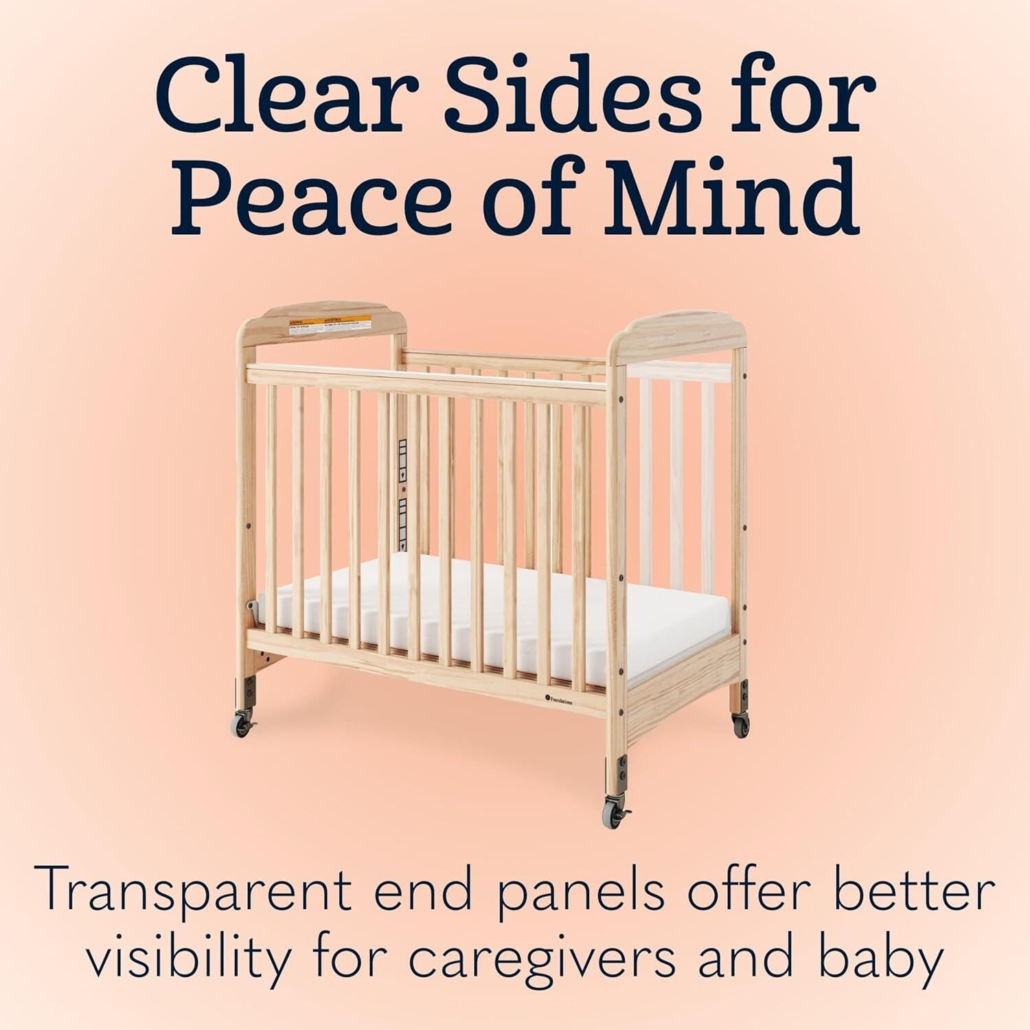 The classic look of this compact crib combines with safety features and convenience to create an unbeatable value. The lower profile sides allow easier access to baby and reduce back strain, while the easy-to-clean teething rail protects side bars. Clear end panels make it easy to keep an eye on sleeping infants. Mortise and tenon headboard construction and solid steel frame provide unprecedented strength. Also includes adjustable mattress board, ultraquiet locking casters that won't leave marks on the floor and a 3-inch-deep mattress. Measures 39-1/4 L x 26-1/4 W x 40 H inches.Features