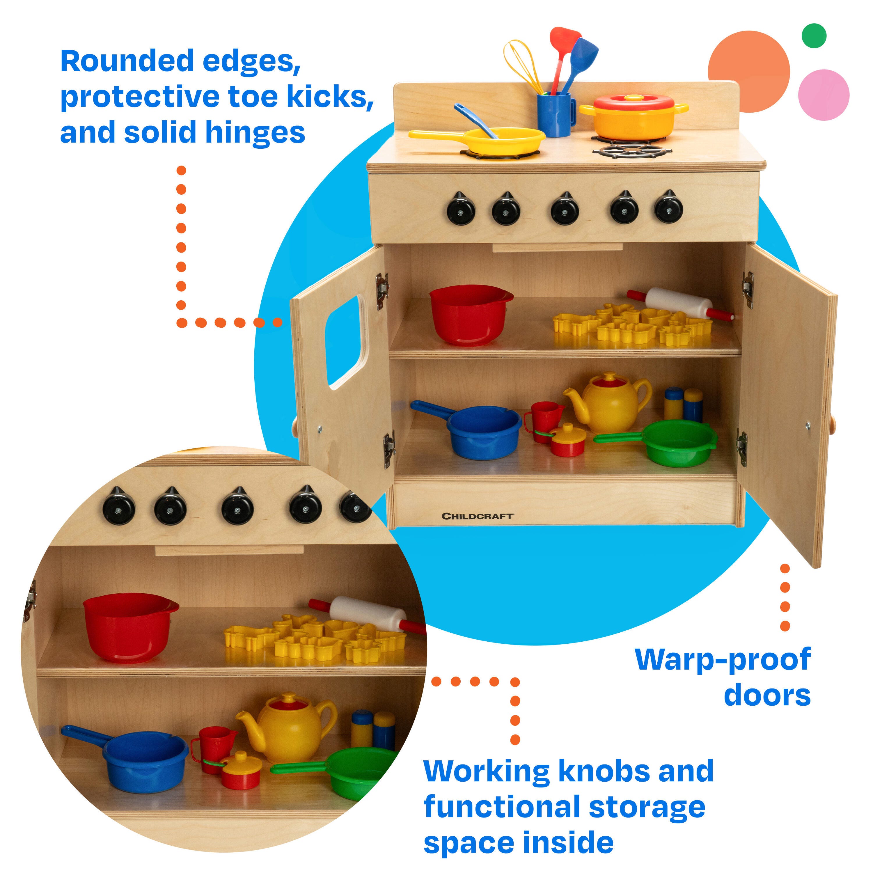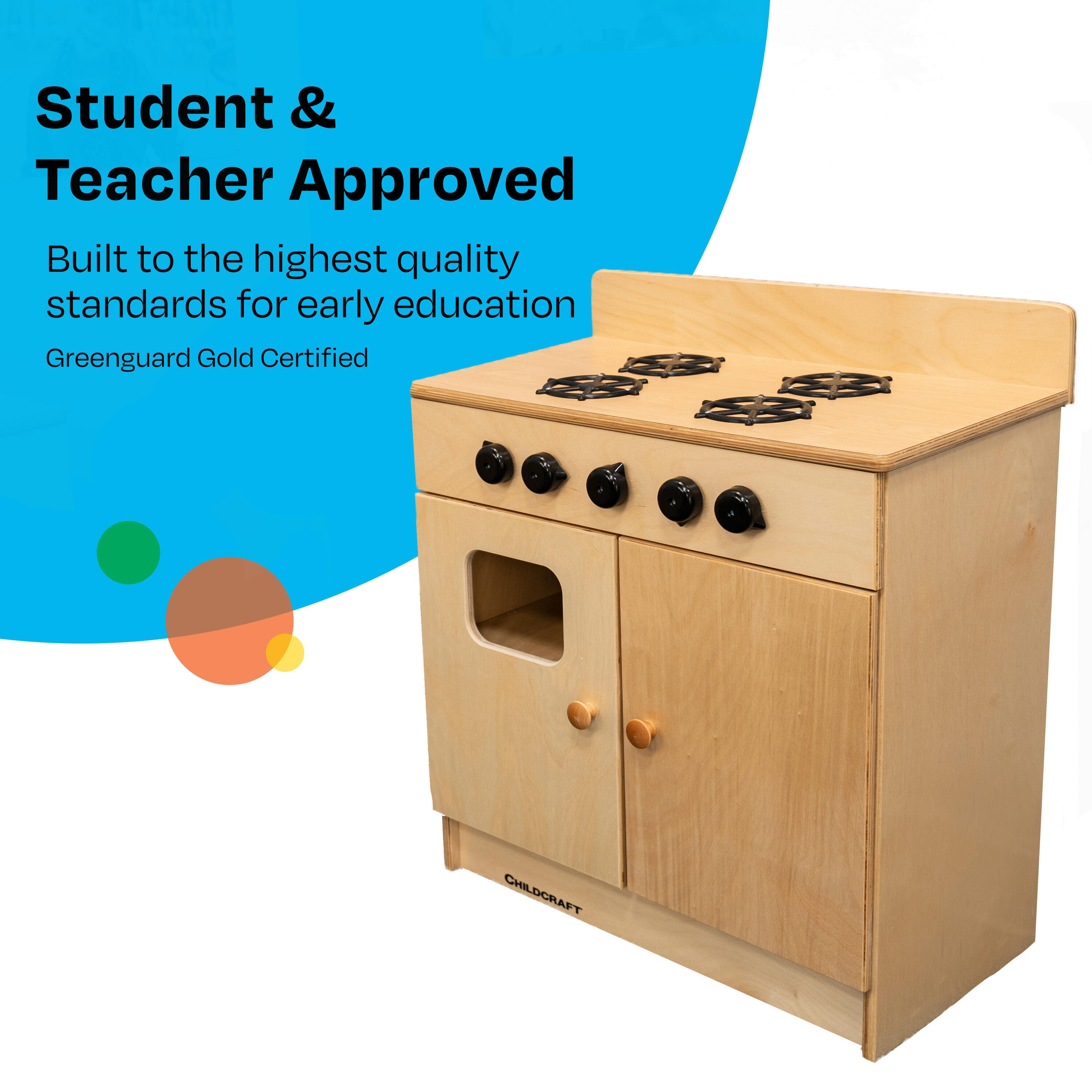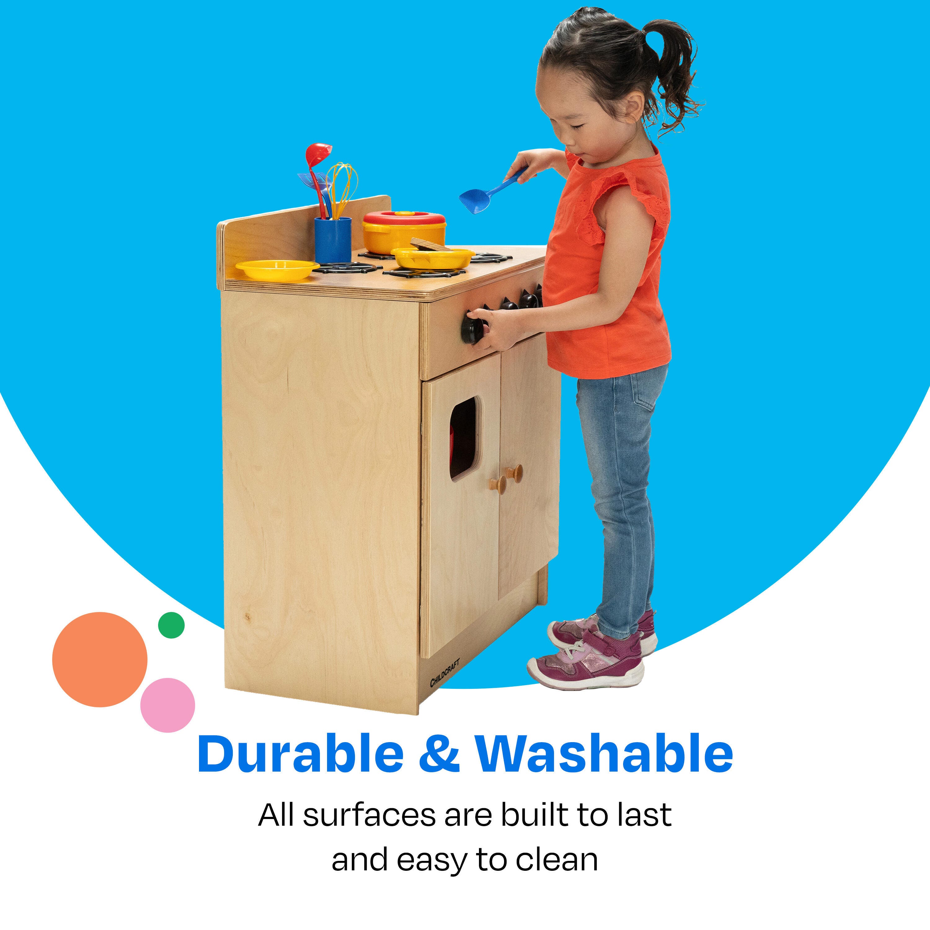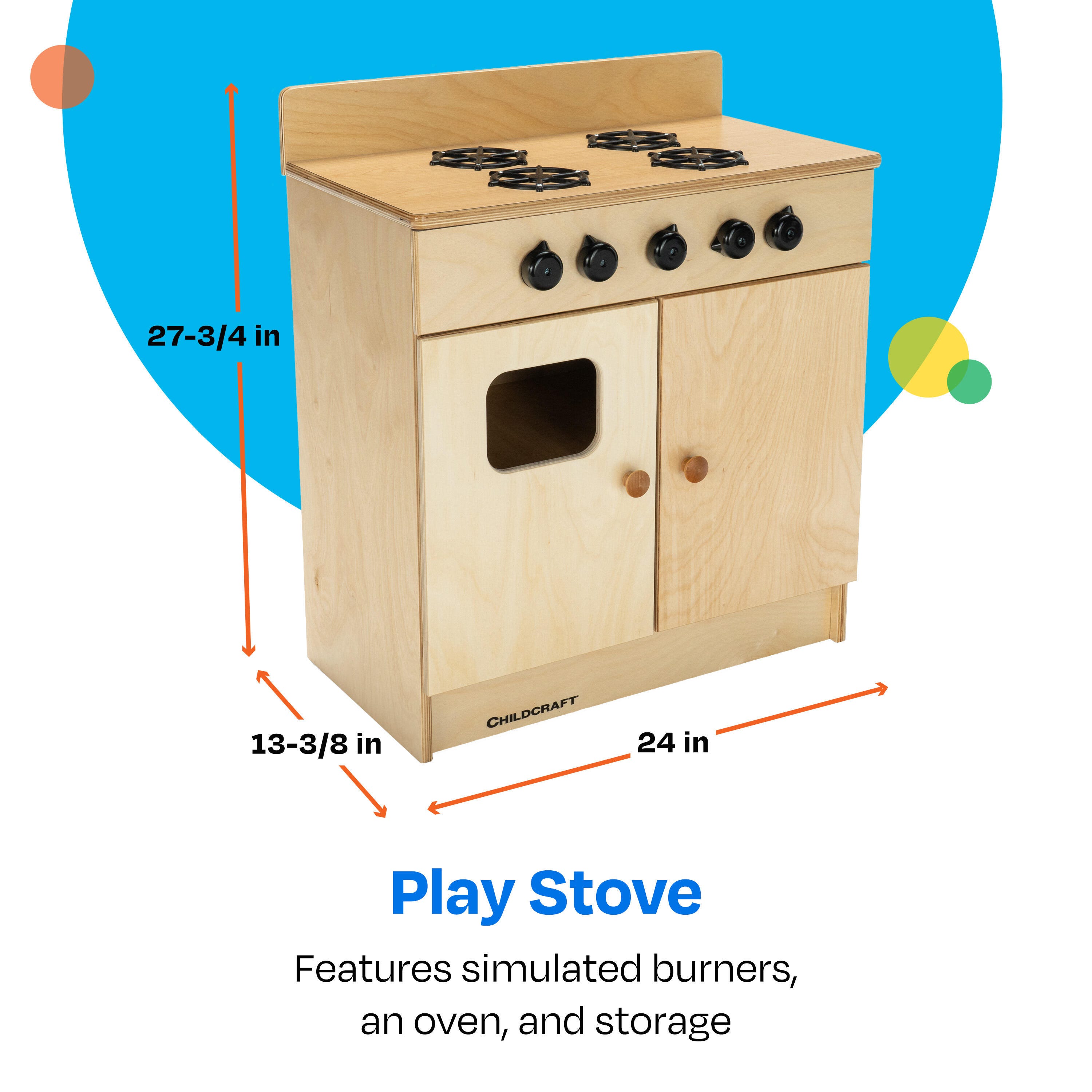 Childcraft® Traditional Play Stove is crafted for imaginative play and safe use in schools, childcare centers, and homes. The wooden play stove features four simulated burners, working knobs, an oven with window, and functional storage space inside. The full plastic laminate tops and washable surfaces make it easy to clean and maintain. Simple assembly is required to affix the backsplash and door handles, and all hardware is included. We also offer matching wooden kitchen pieces to complete your full pretend play kitchen setup. The stove with oven unit measures 24 W x 13-3/8 D x 27-3/4 H inches.