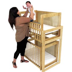 L.A. Baby Modular Wood Crib System is used for convenient space saving and has acrylic panels for visibility and sneeze-guard protection. It features a adjustable mattress support panels and includes vinyl covered high density foam mattresses. Sturdy riser frame elevates the upper crib to an acceptable height. Lower crib is a fixed sided design that includes four swivel casters. 45-3/8 L x 27-3/8 W x 53-1/2 H inches.
