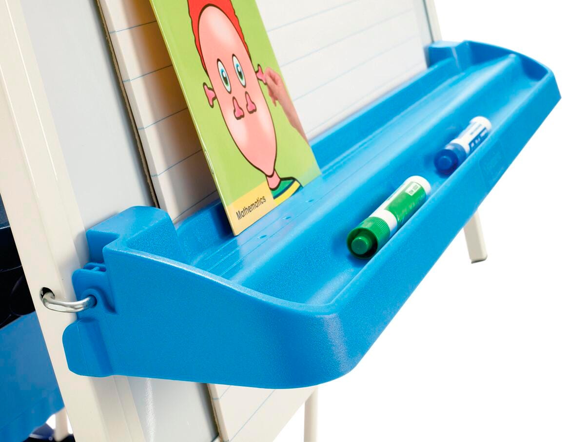 This easel is now available with see-through hinged lids that make it easy to keep things tidy and allows the tubs to be stacked when not in the cart. The hinge eliminates the need to remove the lid when accessing materials inside, so no missing lids! This easel is an essential teaching tool for all primary and junior classes. Designed with teacher-driven features that help keep everything organized and lessons more engaging. It combines a chart stand, storage for books and materials, dry erase surfaces and a book ledge for story time.