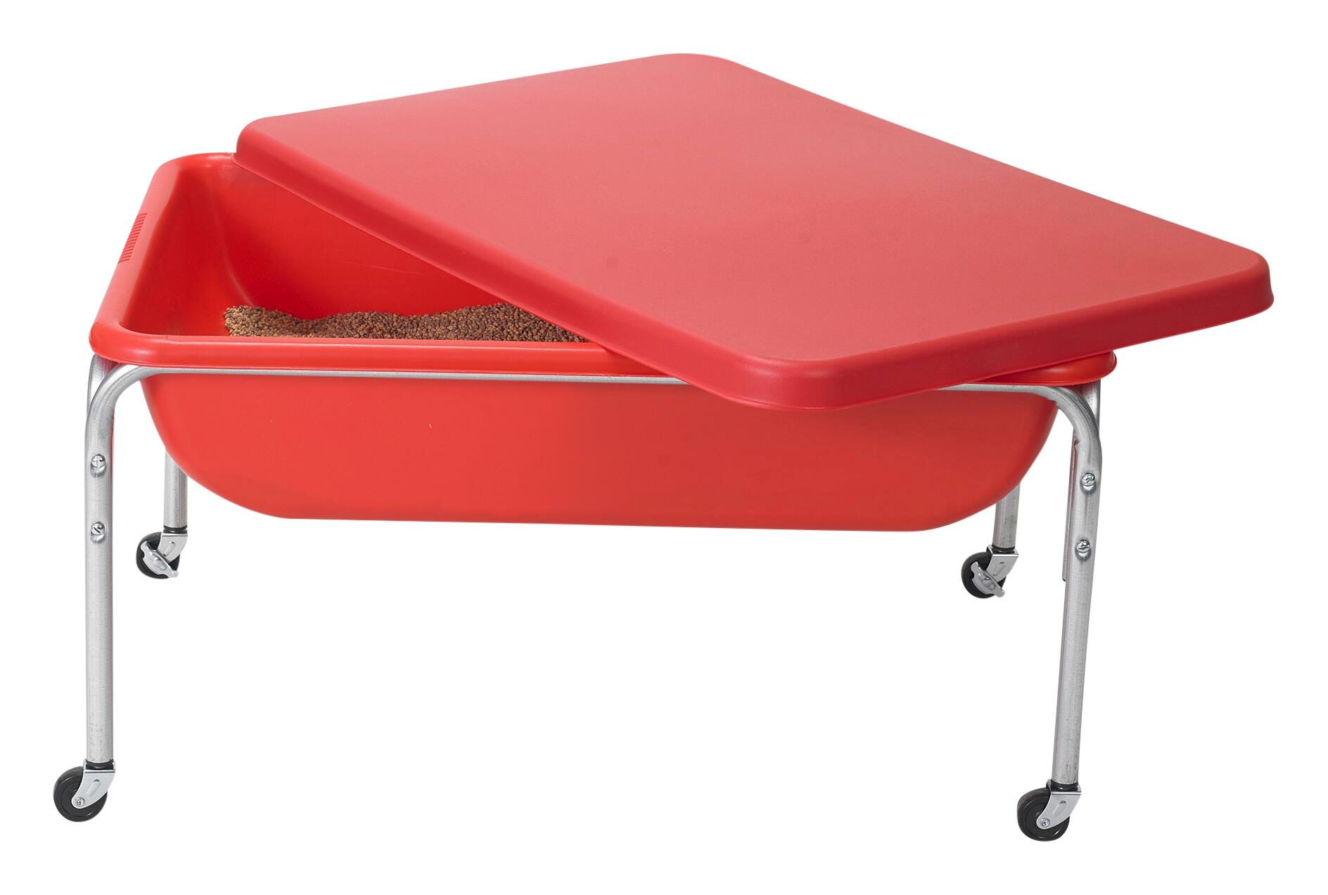 Children's Factory Medium Sensory Table with Lid has four casters (2 locking and 2 non-locking.) Tub is made of sturdy, weather-proof plastic with a rust-proof chrome steel frame. Table measures 36 W x 24 D x 18 H inches.