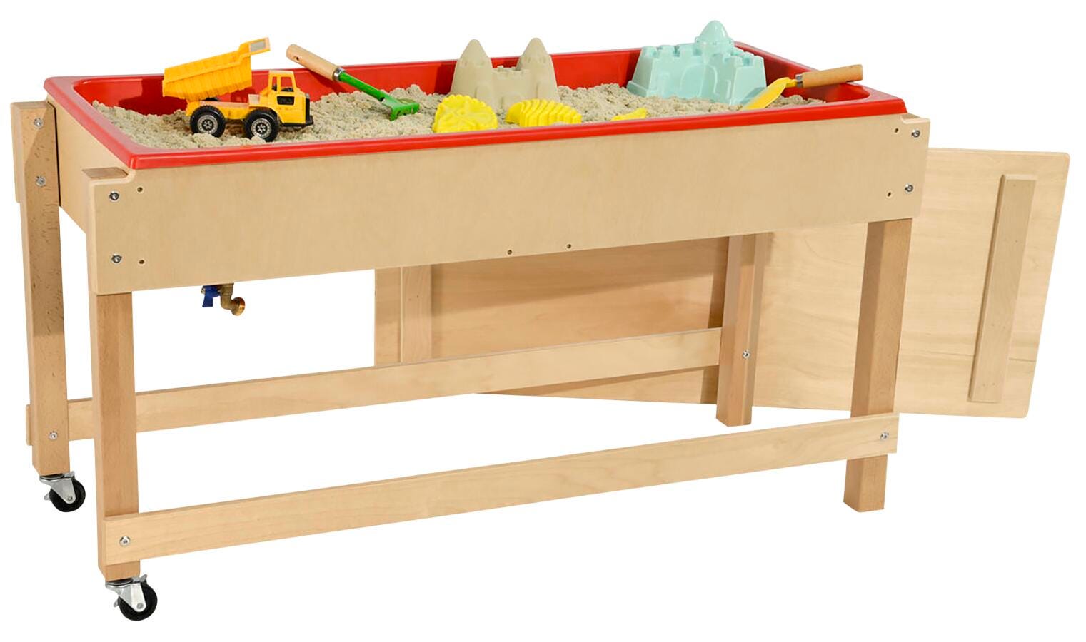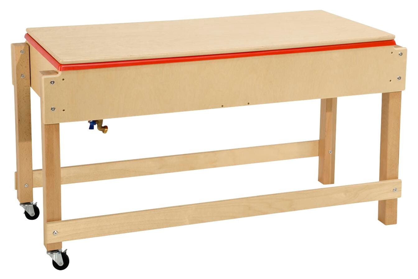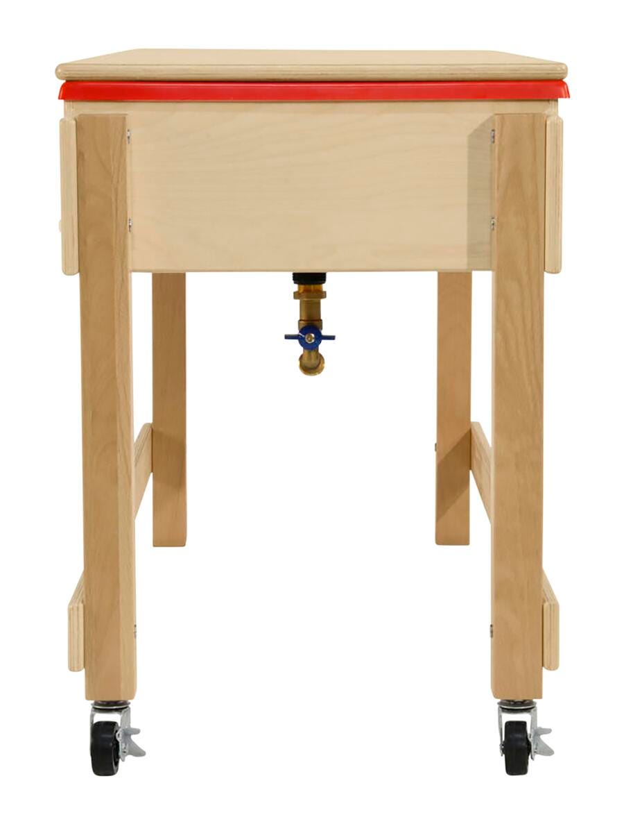 This table works great with rice, cereal, sand, water, and many other sensory materials! It features a rugged 6-inch deep plastic liner tray, a drain faucet, and casters on two legs for easier drainage and clean up after the fun is done. The included lid allows you to cover the tub which creates a work surface or place it underneath the tub to create a shelf that stores manipulatives. This table is constructed from 100% plywood and coated with our exclusive Tuff-Gloss™ UV finish. Designed with your students in mind, it has fully rounded corners and edges for maximum safety.Features