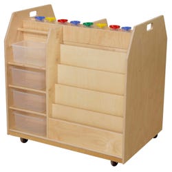 This Trolley Art Cart by Wood Designs can store all of your art center resources, from paint to paper to pencils. Constructed from birch plywood and coated with our exclusive Tuff-Gloss™ UV finish to withstand the wear and tear of a bustling classroom. Fully rounded corners and edges for maximum safety. Measures 37 W x 27 D x 36 H inches.Features