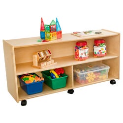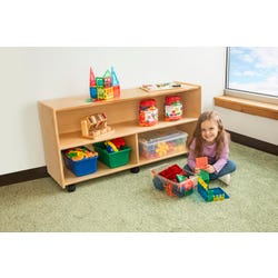 The Childcraft® Mobile Storage Unit with 3 openings, provides ample space for organizing supplies, books, games, bins, and more in classrooms, childcare centers, and homes. Featuring spacious openings, this bookcase also comes with heavy-duty caster wheels for effortless mobility around the room. Crafted from durable birch plywood with a beautiful natural veneer finish, this wooden bookcase is built to last. A convenient design makes it easy for children to access what they need. Measures 47-3/4 W x 14-1/4 D x 24 H inches. Comes fully assembled.