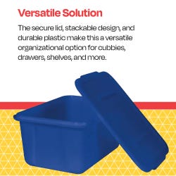 Store arts and crafts supplies, educational materials, toys, seasonal decorations, and more with the School Smart blue storage bin with a non-snap lid. Our plastic storage bins with lids are sturdy, versatile, and stackable. Use them alone, place alongside other storage boxes, or store within deeper drawers in your classroom, childcare center, or home. The colorful plastic bin has a matching lid that secures down firmly on top and helps prevent young children from taking items out.Features