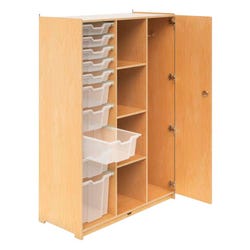A purpose-built wardrobe for Early Childhood teachers! Integrated storage solutions that every teacher needs. The left column includes drawer glides that accommodate five shallow, four medium and one large tray (all included). The center column features one fixed shelf in the center and an adjustable shelf above and below that provide flexible configuration. The right column features a full-height locking exterior door mounted on four sturdy European soft-close hinges for safety. Inside features double prong coat hooks mounted on each side wall and ceiling. Wall attachment brackets included. Constructed with no visible screws or joinery for a fine finished furniture look.
