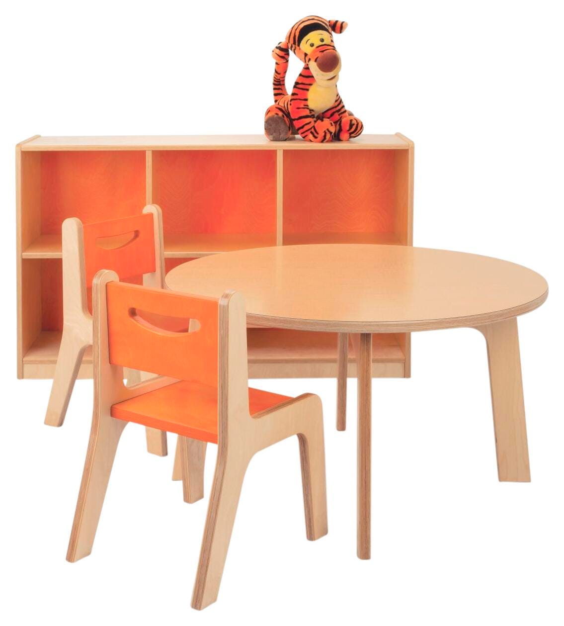 Our 22-inch height Maple Top Round Table is constructed in beautiful 1-inch thick birch plywood for superior strength and durability in a natural UV finish. The table surface is finished in the same high pressure laminate (HPL) used on kitchen counters, making these tables extremely scratch resistant and able to withstand rigorous use by children. The table is available in heights of 18", 20" and 22."