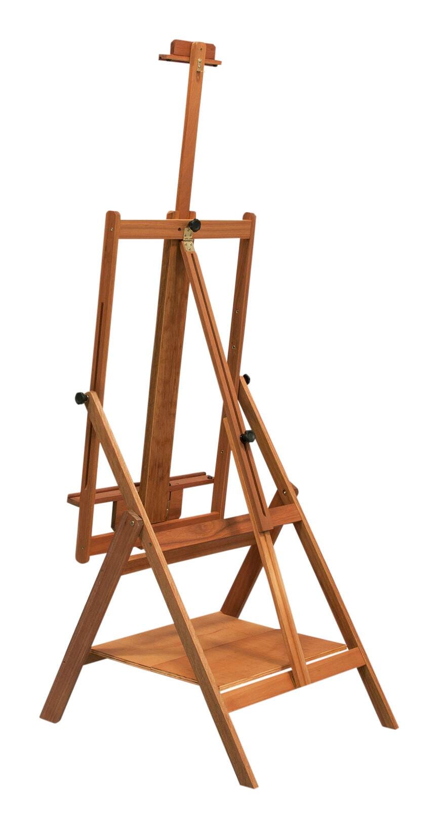 Jack Richeson Lyptus Lobo Easel crafted from hand-rubbed, oil-finished, solid oak for beauty and longevity is a compact, versatile and an affordable easel. A multitude of angle settings accommodate the watercolor, pastel and oil painter. Easel with 24 in x 27 in base holds canvases up to 55 in and has height that adjusts from 65 in - 95 in. Easel can be completely folded flat for convenient storage. The horizontal table height can reach 36 inches. Handy features include a supply shelf underneath the frame, adjustable painting tray, retractable mast and bottom tray.Features