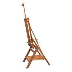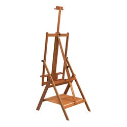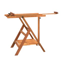 Jack Richeson Lyptus Lobo Easel crafted from hand-rubbed, oil-finished, solid oak for beauty and longevity is a compact, versatile and an affordable easel. A multitude of angle settings accommodate the watercolor, pastel and oil painter. Easel with 24 in x 27 in base holds canvases up to 55 in and has height that adjusts from 65 in - 95 in. Easel can be completely folded flat for convenient storage. The horizontal table height can reach 36 inches. Handy features include a supply shelf underneath the frame, adjustable painting tray, retractable mast and bottom tray.Features