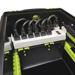 This Tech Tub has all the features of the premium models, including a padlock for securing the devices inside. The only difference is there is no locking block and pin to secure the tub to surfaces. It has the capability to charge up to 6 iPads. It makes sharing small sets of devices easy within a classroom or throughout a school. Adjustable dividers can accommodate most cases and the side cable channel helps keep cords neat, tidy and lined up with each device.Features
