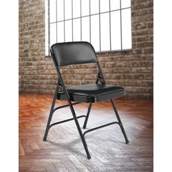 National Public Seating 1300 Series Premium Vinyl Folding Chair with vinyl seat features heavy 18-gauge steel Black frame for durability and ''V'' shape plugs on rear legs for added stability. Chairs have double hinge on each side to prevent legs from buckling and double riveted stronger ''U'' brace. Chair features a fully upholstered backs and 1-1/4 inch padding on the seat with heavy duty vinyl for comfort as well as durability. Chair includes an addition of a second back leg cross brace to give it triple the strength of a standard chair along with matching glides. Constructed with a 17-3/4 inch seat height.Features