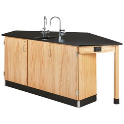 Diversified Woodcrafts Forward Vision I 4-Student Workstation with sink measuring 8 feet x 50 x 36 inches its superlative design offers the instructor optimal visibility. One side of the station offers good work area for the students while the other side offers storage area. It features a solid epoxy resin top which resists extreme chemicals and heat and it also includes two electrical outlets.Features