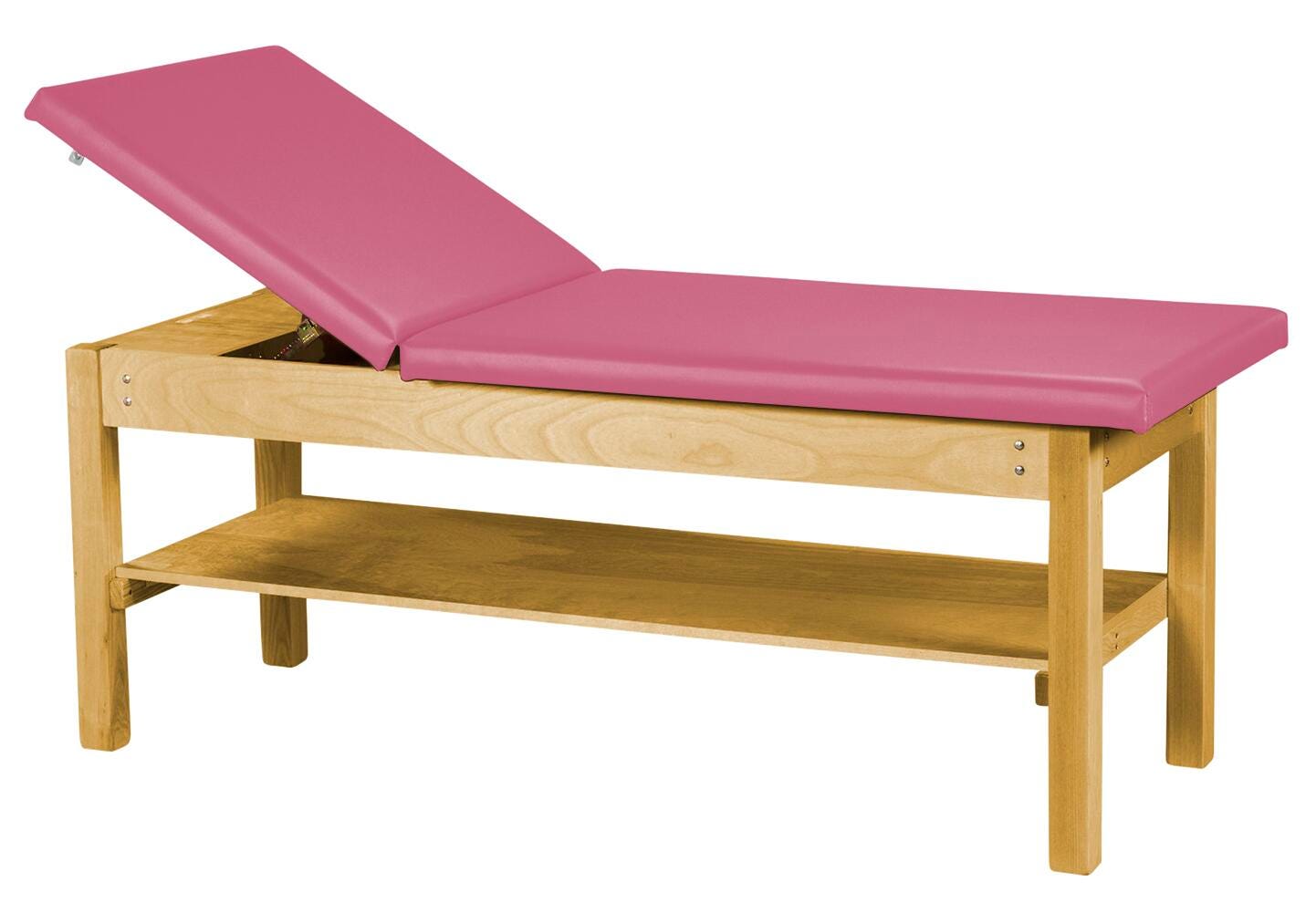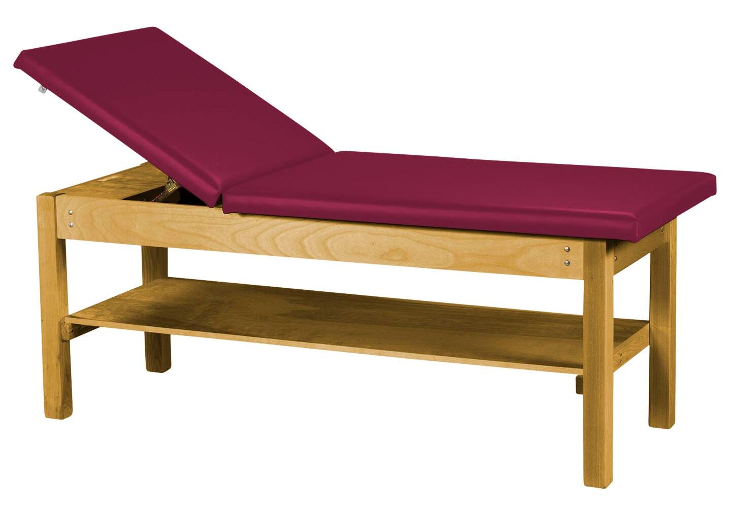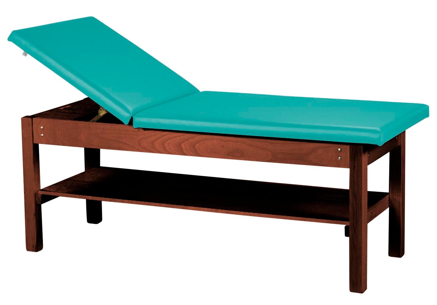Treatment table with open storage and backrest. Has a full-length shelf underneath for storage. Measures 78 L x 30 W x 30 H inches.