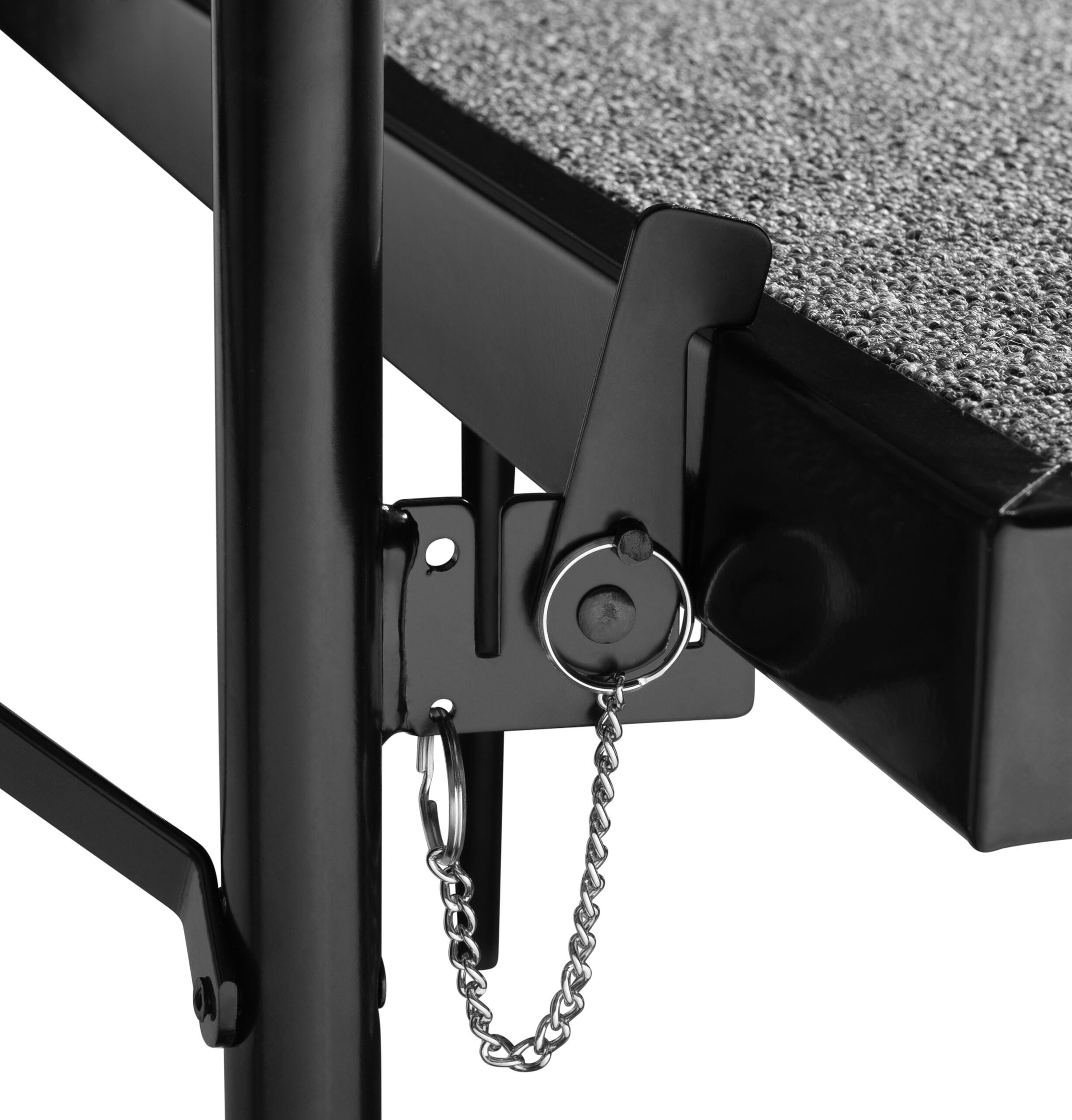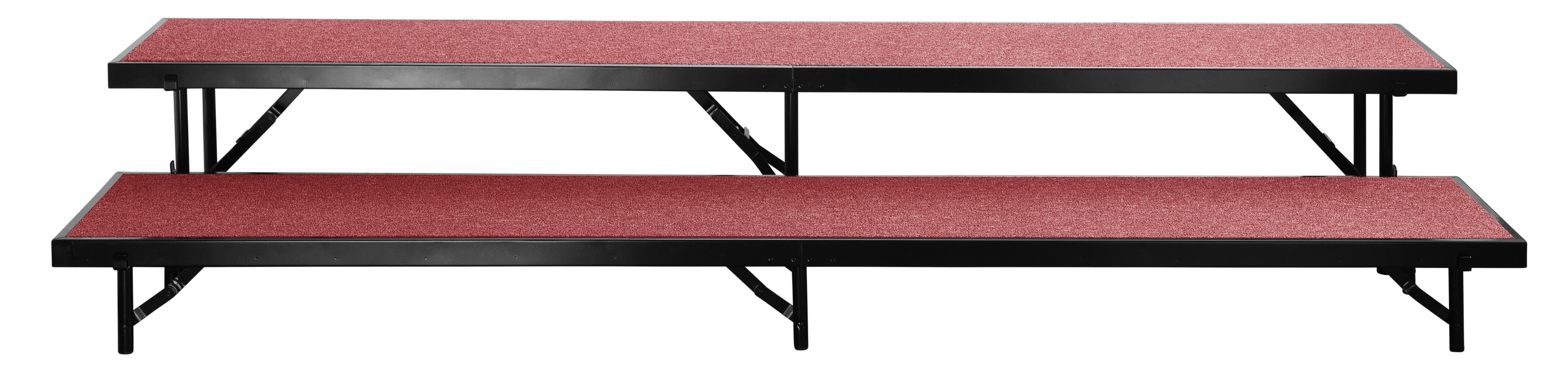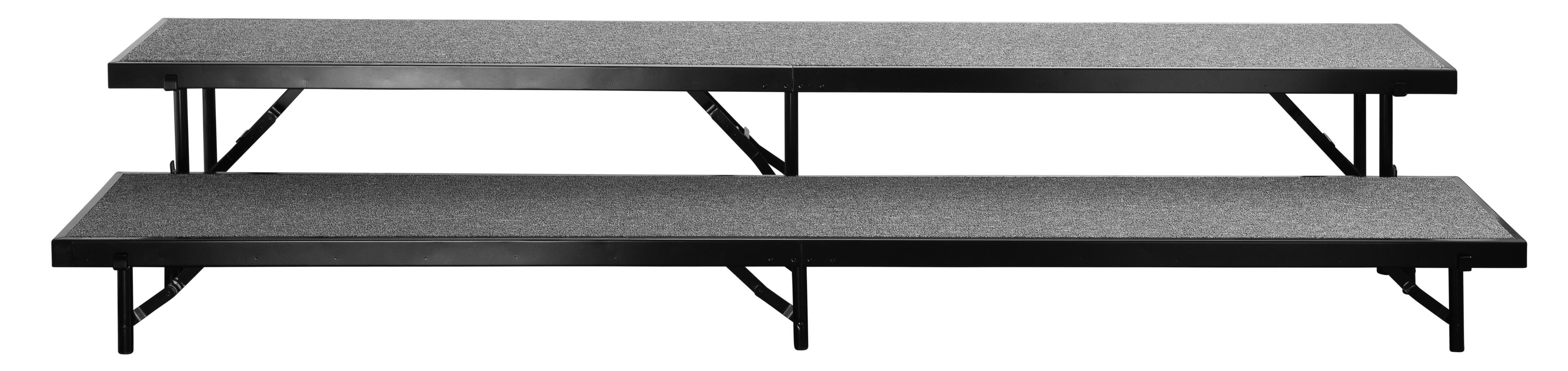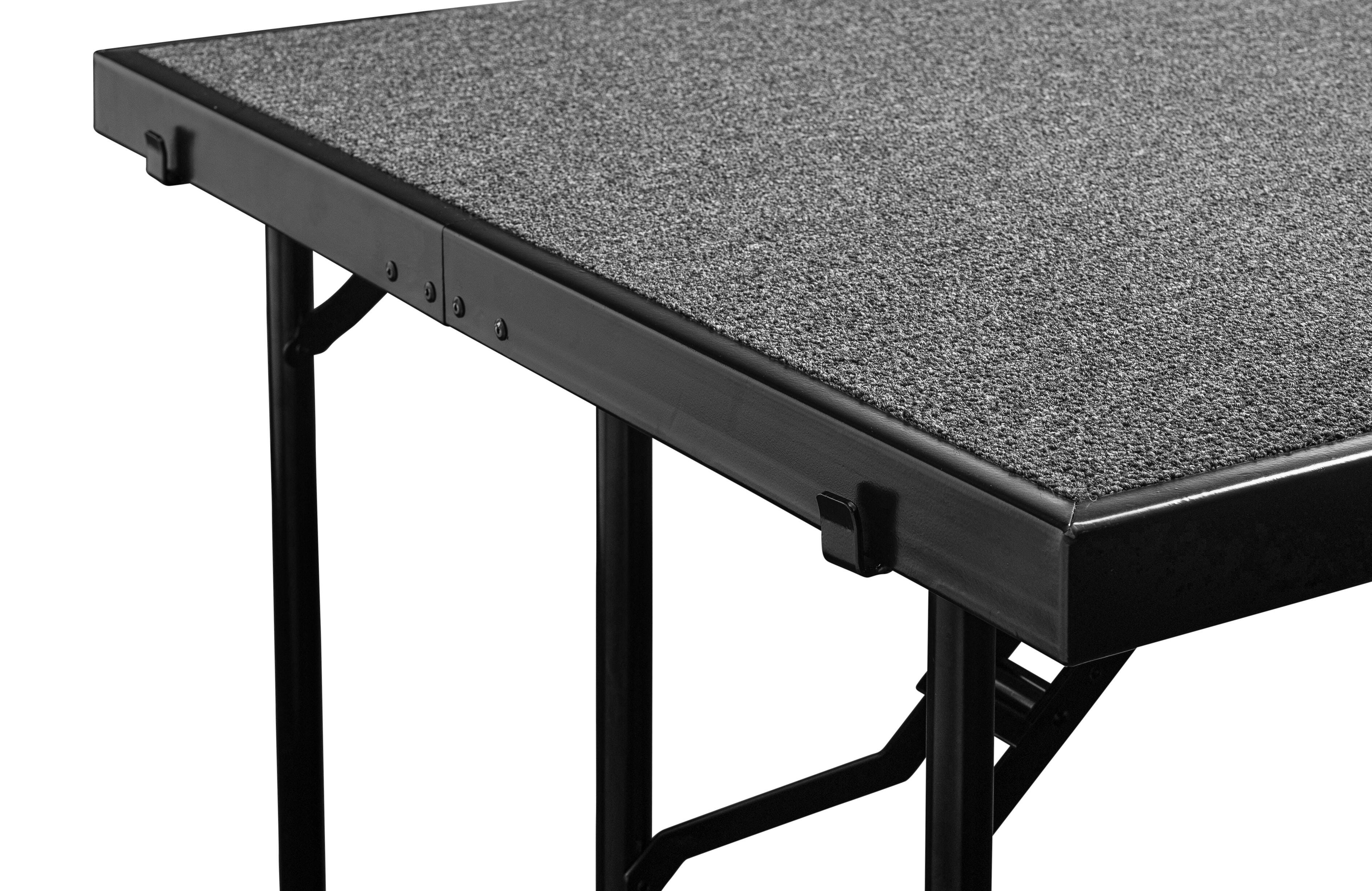 Rise to the occasion! The NPS Straight Carpeted Multi-Level Standing Riser is a reliable and affordable choice for your school performances and assemblies. Users are supported by a heavy-duty, 16-gauge steel, black powder-coated frame. The premium 3/4 thick plywood deck is durable and features a firmly-affixed carpeted surface. The legs are constructed with 14-gauge steel tubing and feature simple and safe spring-loaded locking mechanisms allowing for quick set-up assembly and folding up easily for manageable portable storage. The stage offers a secure weight capacity of over 200 lbs. per square foot. High-impact plastic glides will ensure floors are protected from damage.Features