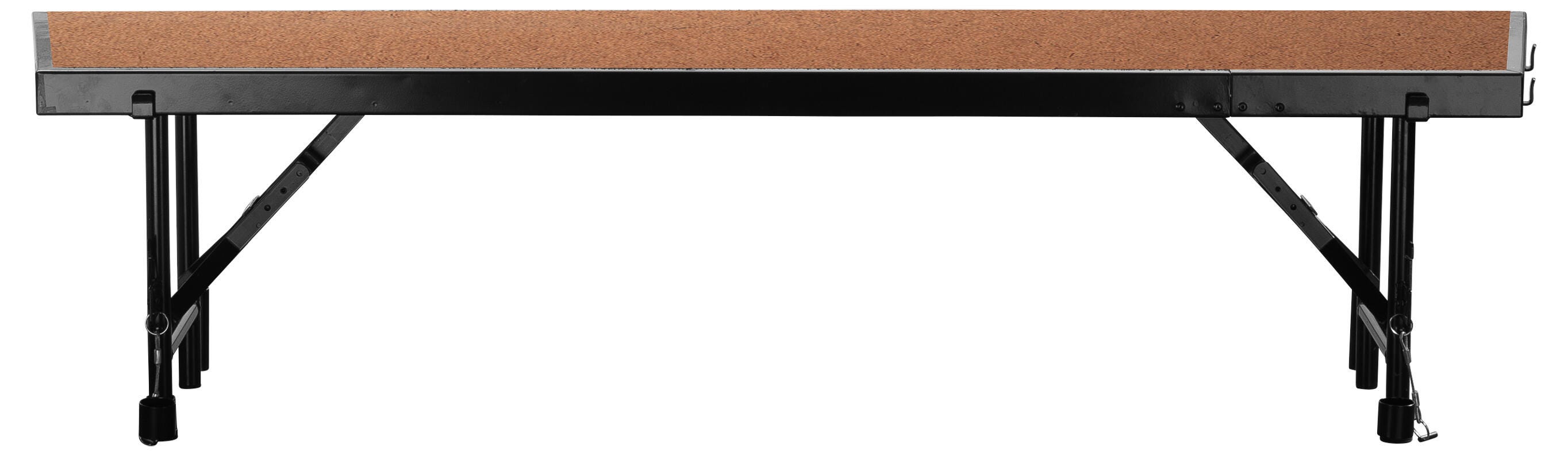 Tapered Portable Standing Riser has a durable 16-gauge steel frame, and premium grade 3/4-inch solid plywood core covered with hardboard. Legs are made with 14-gauge tubular steel capped at the point of floor contact with high impact plastic glides. Riser equipped with drop-in couplings that allow units of same or different heights to be joined together. All ganging devices are permanently secured to each unit and can be easily attached to another to build multi-level heights. Riser is easy to set up and allows for quick continuous or semi-circle arrangements for all performance venues. Optional Guardrails for safety are sold separately. Measures 96 L x 18 D x 16 H inches.Features