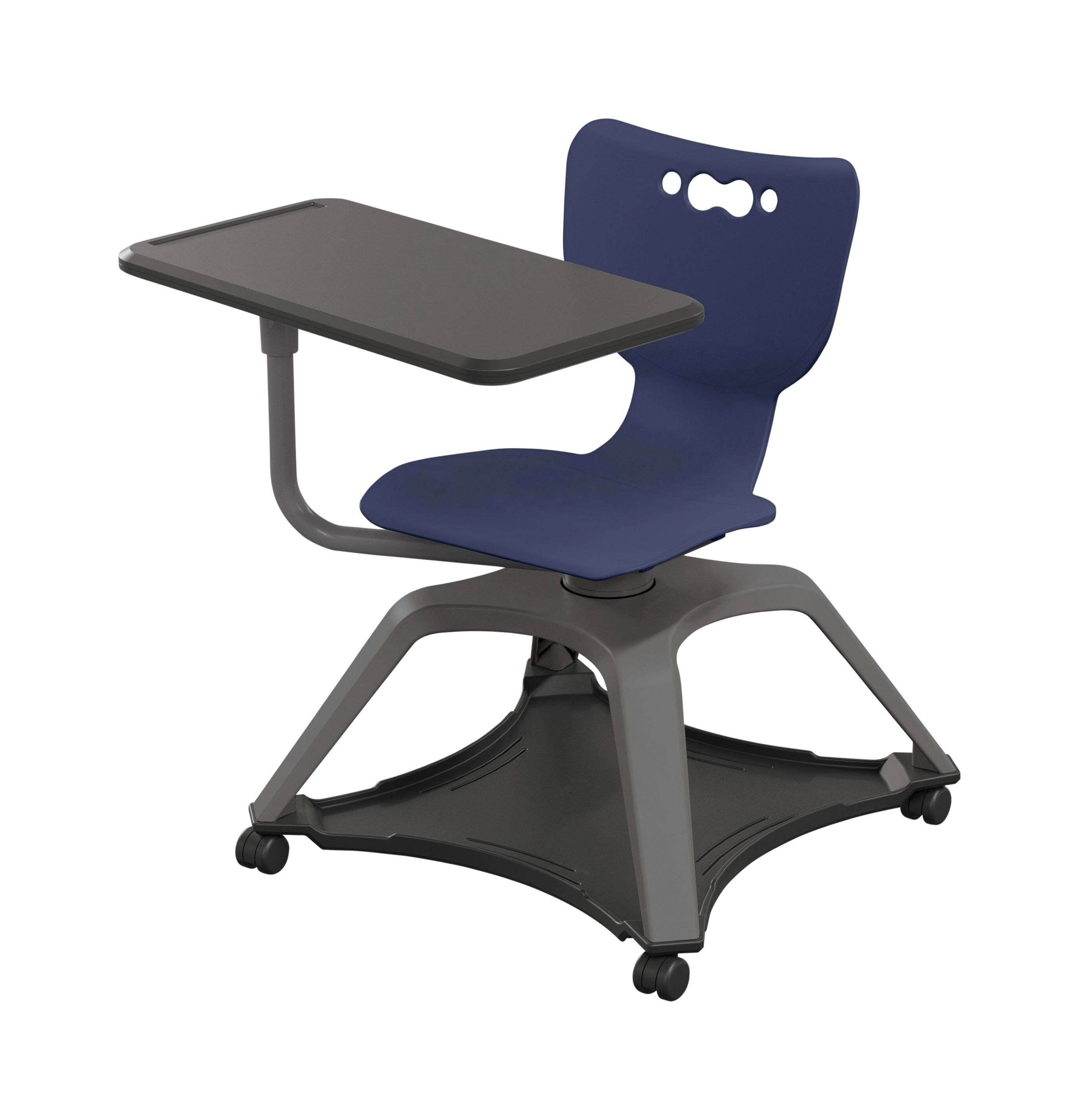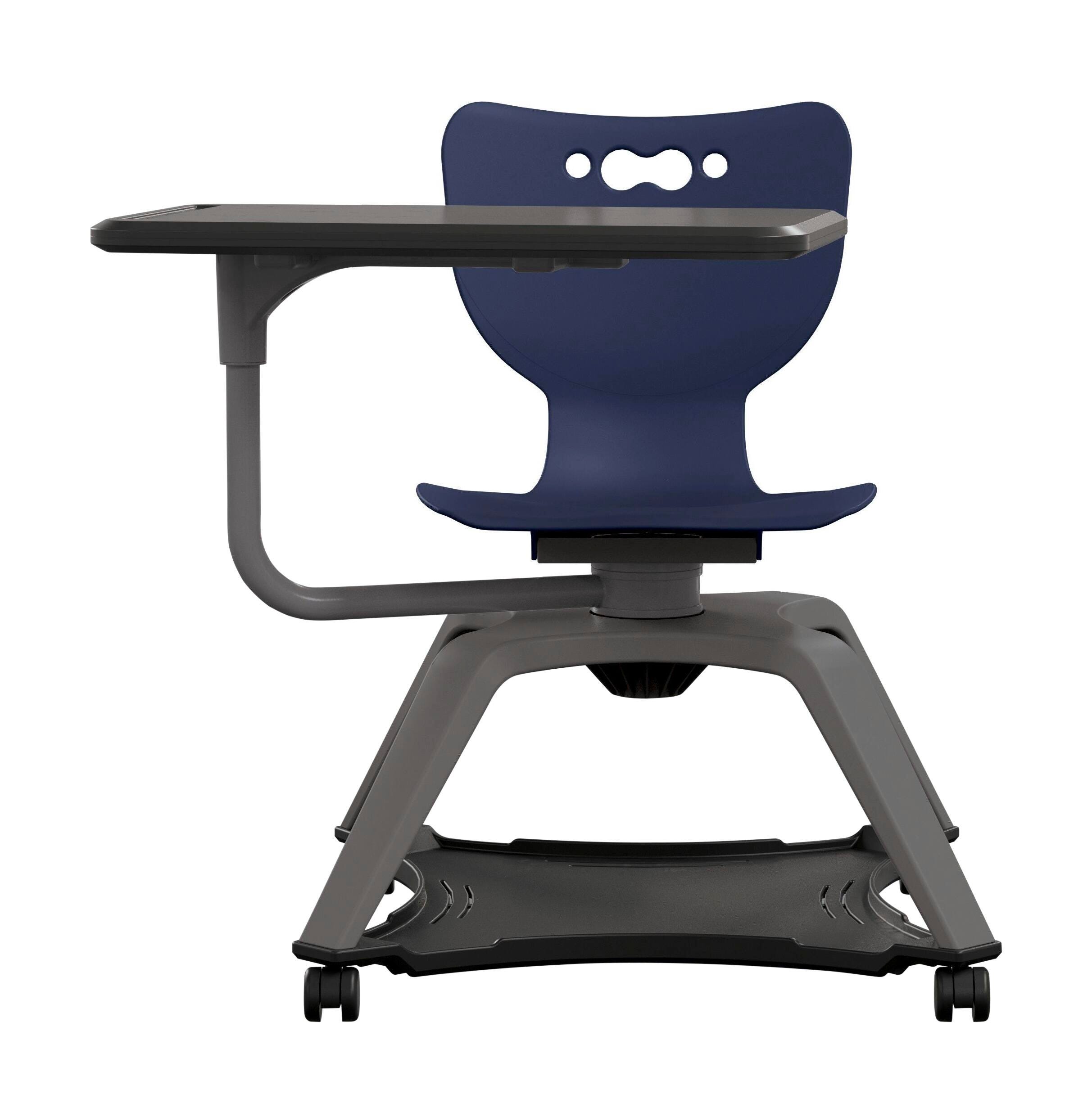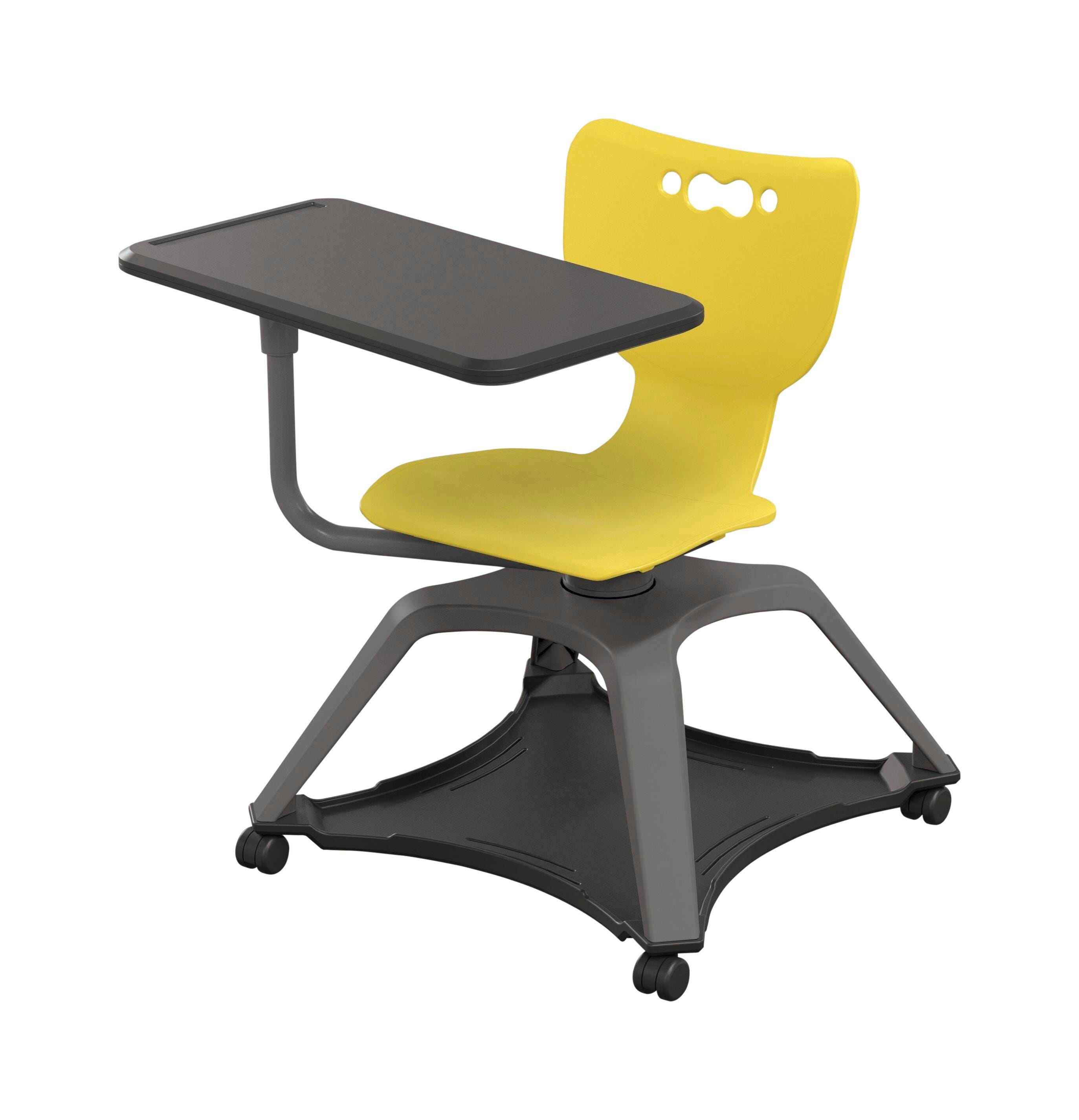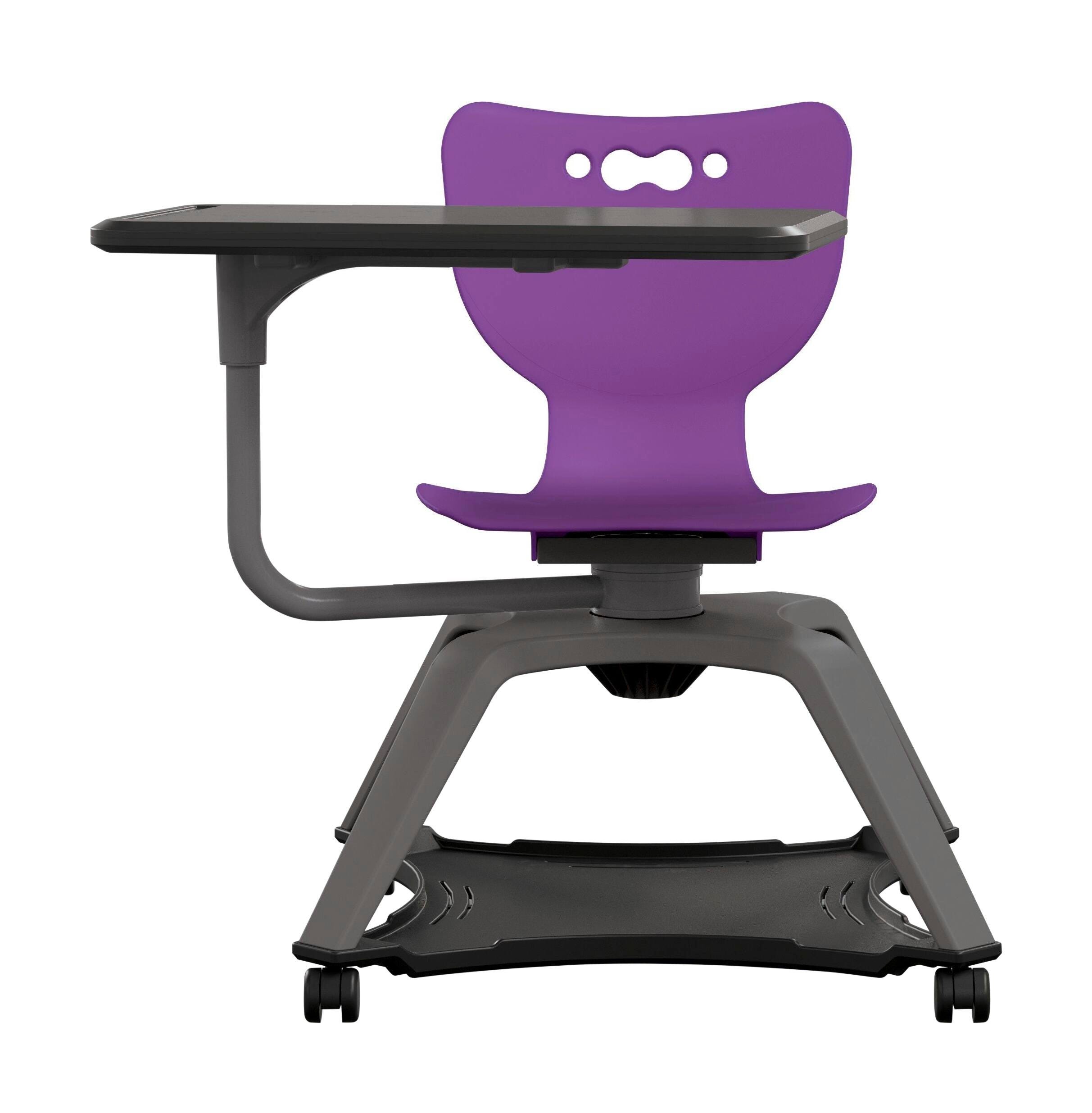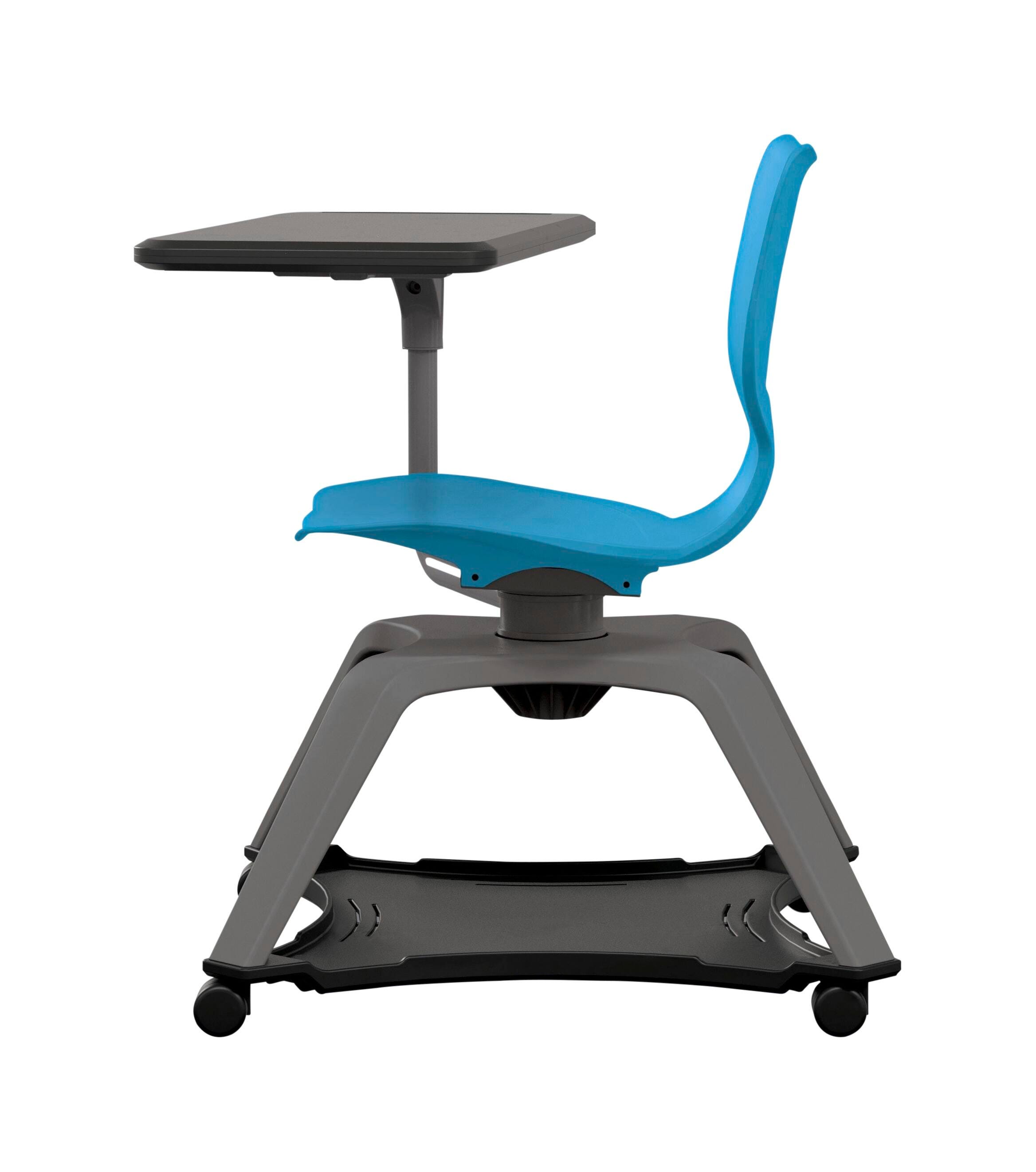 This mobile and versatile chair offers easy communication, movement, and storage for high-energy spaces. Featuring a swivel seat that allows students to shift focus throughout the room with ease, the Enroll Chair makes collaborative room configuration a breeze. Tablet surface is 26 x 14 inches to support high-tech classrooms, and has a height of 29-3/4 inches from the floor, The surface also includes a built-in pencil or stylus holder in the tablet surface, and swivels to adjust to left- and right-handed students. Seat shell is available in 15 color choices. The 21 x 21 inch under storage rack is good for backpacks, books, and other belongings.