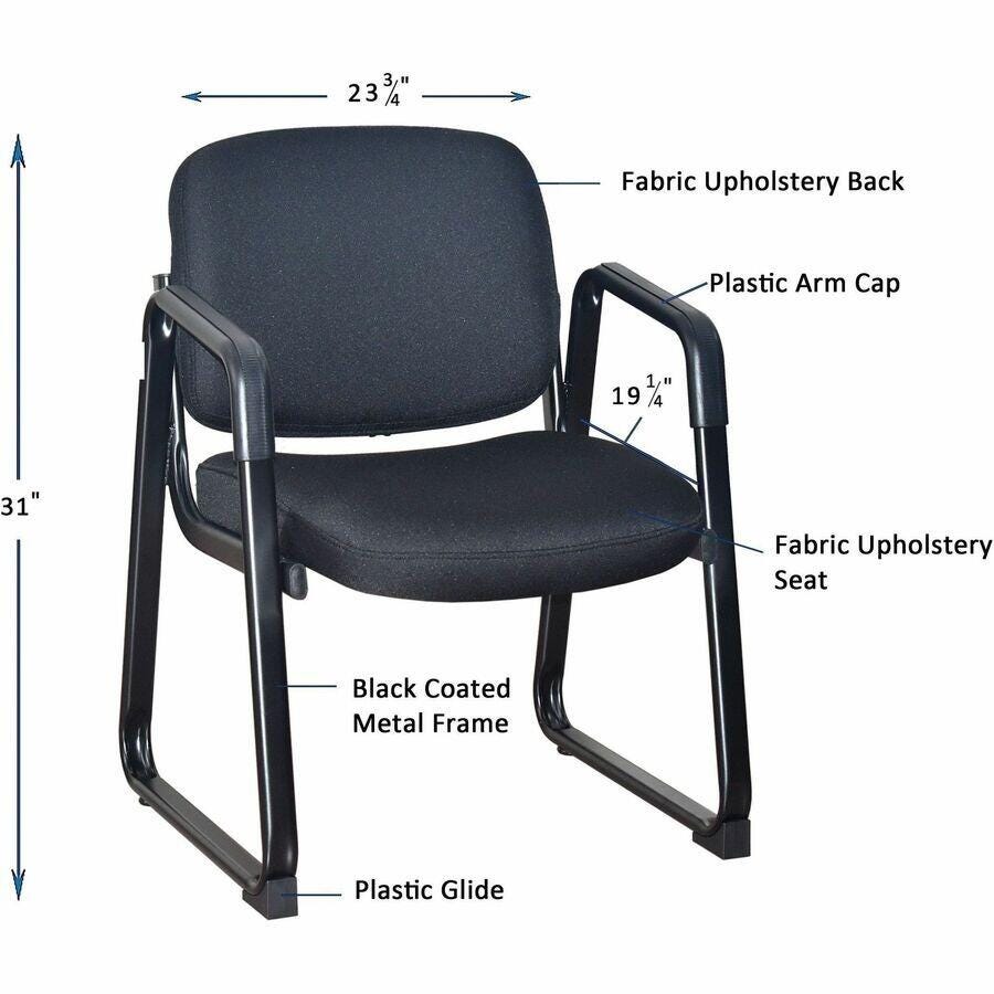 Lorell Guest Chair with fabric-upholstered, padded seat and back offers deluxe comfort for your waiting room, office, teacher's lounge, or anywhere people gather. It is made durable with a sturdy plywood core wrapped in padding and fabric, supported by a metal frame. Sled base with stabilizing feet offers a balanced, supportive foundation for your guests. Measures 26 W x 24-3/4 D x 33-1/2 H inches.Features