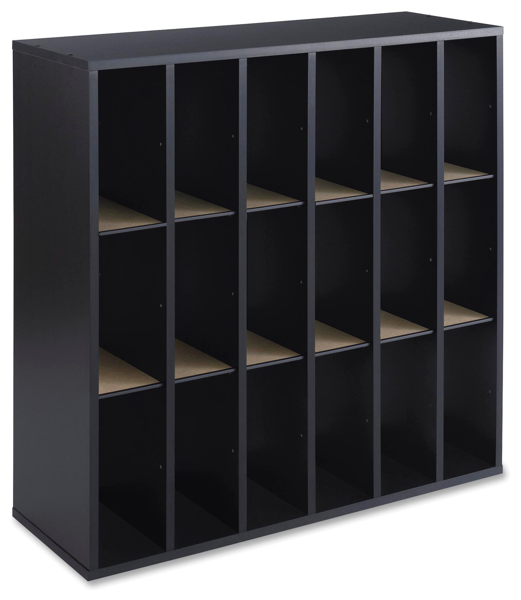 Safco 18 Compartment Mail Sorter in black is crafted from compressed wood with adjustable hardboard dividers. Durable laminate finish compliments any setting while solid fiberboard back provides enhanced stability for the unit. Sorter has large slots to fit in over-sized envelopes. Black plastic molding does double-duty, first as an attractive accent to the finish and second as a label holder for identifying the bins (labels are included). Stack up to two high to increase sorting capability.